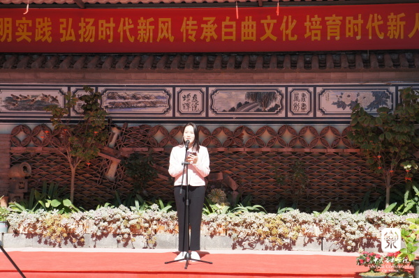 仪式结束后,大理镇龙龛北白族调传习所的传承人董凤琴向来宾介绍和展示了白族调的传承情况,祖孙三代和传习所学员们进行了精彩的表演。