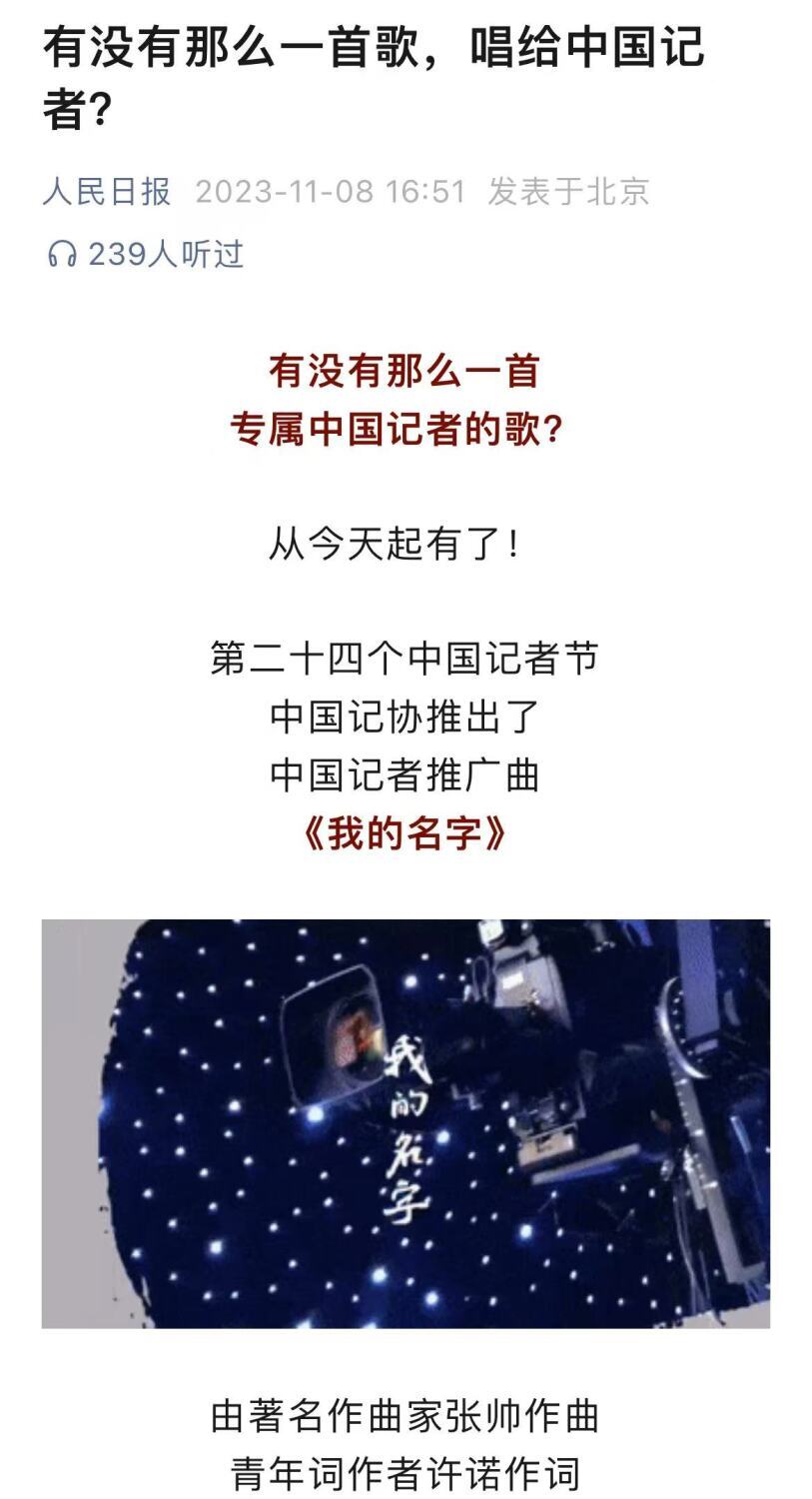 2023年11月8日是第二十四个中国记者节,由KY开元集团官网入口作曲系张帅教授创作的《我的名字》作为中国记者推广曲,由中国记协、人民日报、新华社、中央广播电视总台同步全网推出!