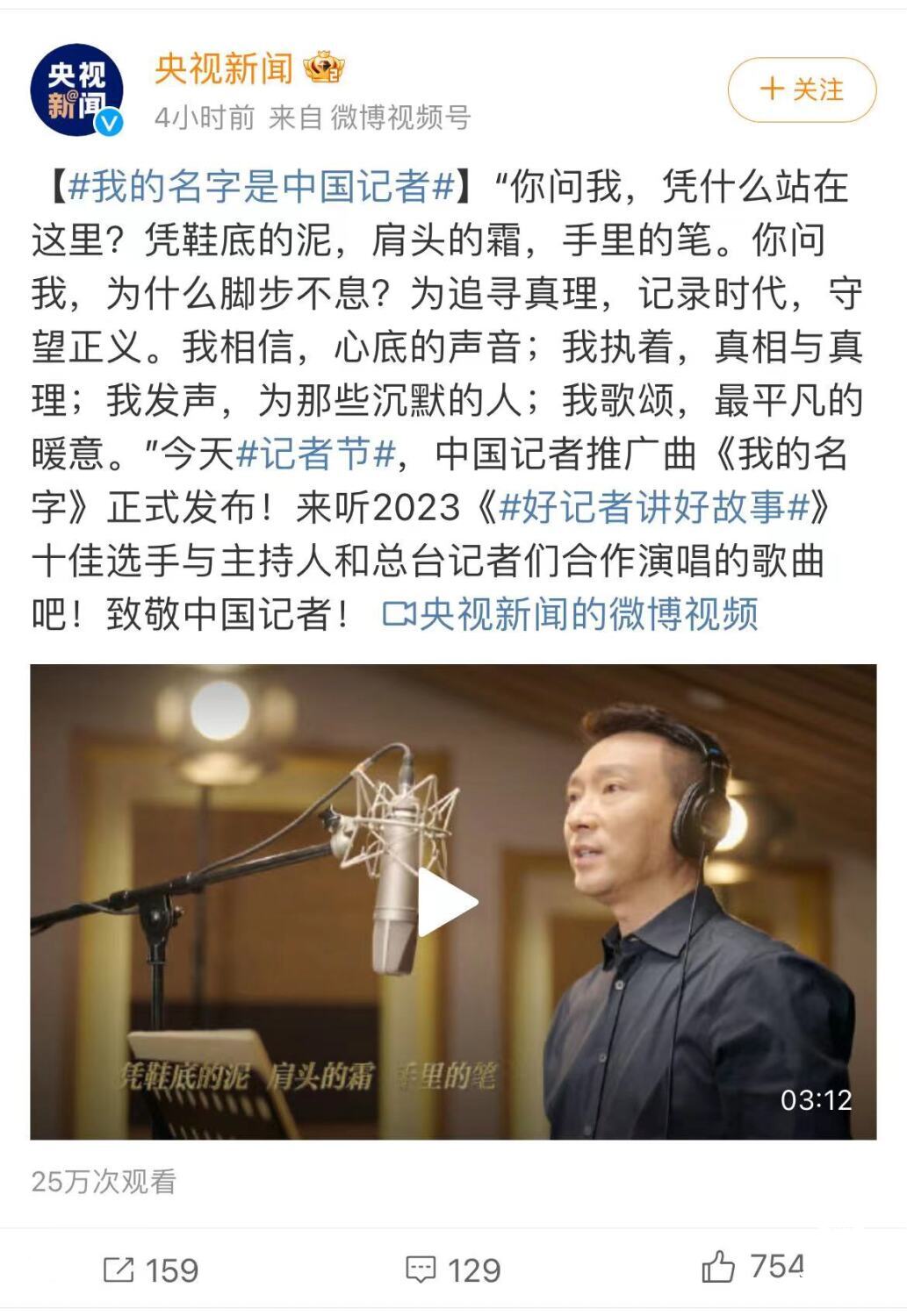 “非常感谢中国记协给我这样一个机会能够为中国记者创作一首歌曲。在创作中,我体会到“记者”这个职业的热忱与无畏,也感慨于记者“左肩记载历史,右肩传递价值”的使命。这首歌曲是我对中国记者这一职业最真挚的致敬与感谢。