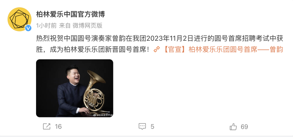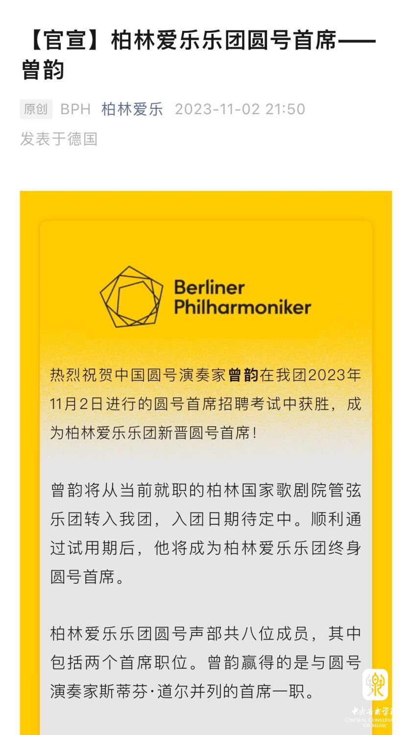 柏林爱乐乐团官网发布消息,热烈祝贺曾韵担任圆号首席(https://www.berliner-philharmoniker.de/news/detail/neuer-solohornist-yun-zeng/)