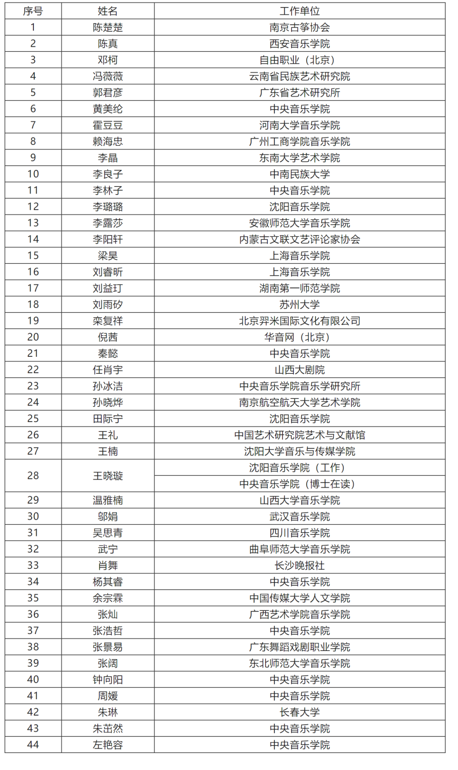 自招生简章发布以来,本次培训活动收到热烈反响,来自全国各地的中青年音乐评论人报名踊跃。经组委会遴选、研究,在原定30名招生计划的基础上扩充至44名。现将名单公布如下(按姓氏拼音排序)。