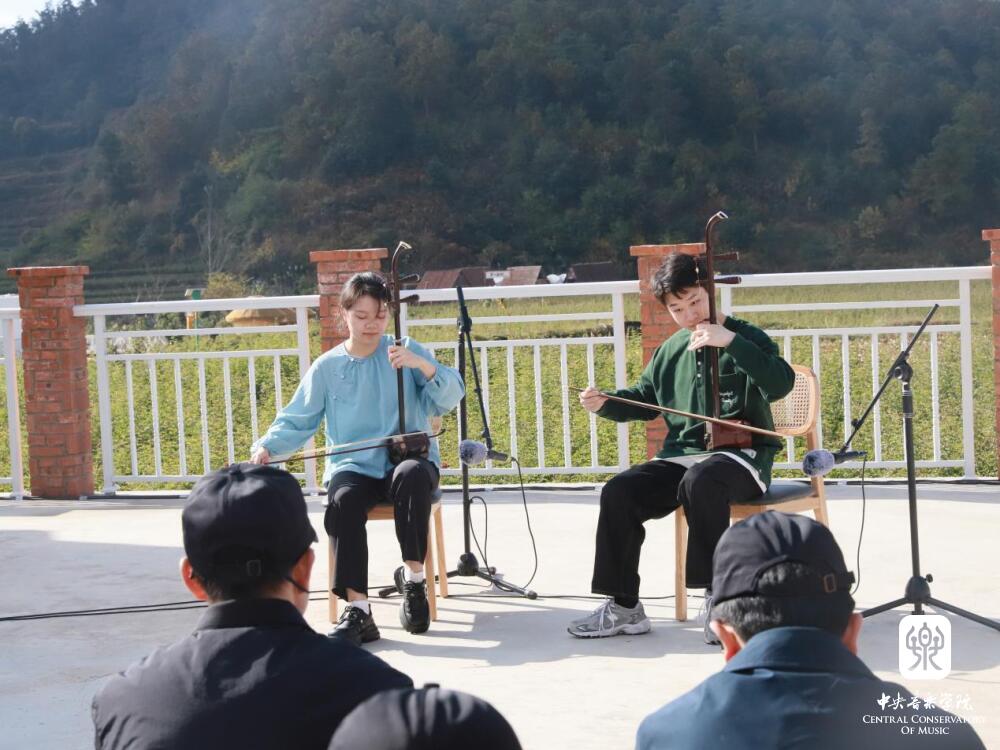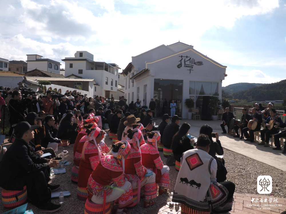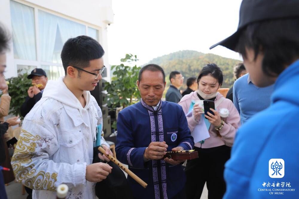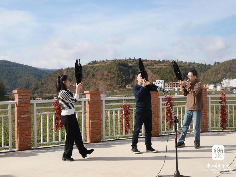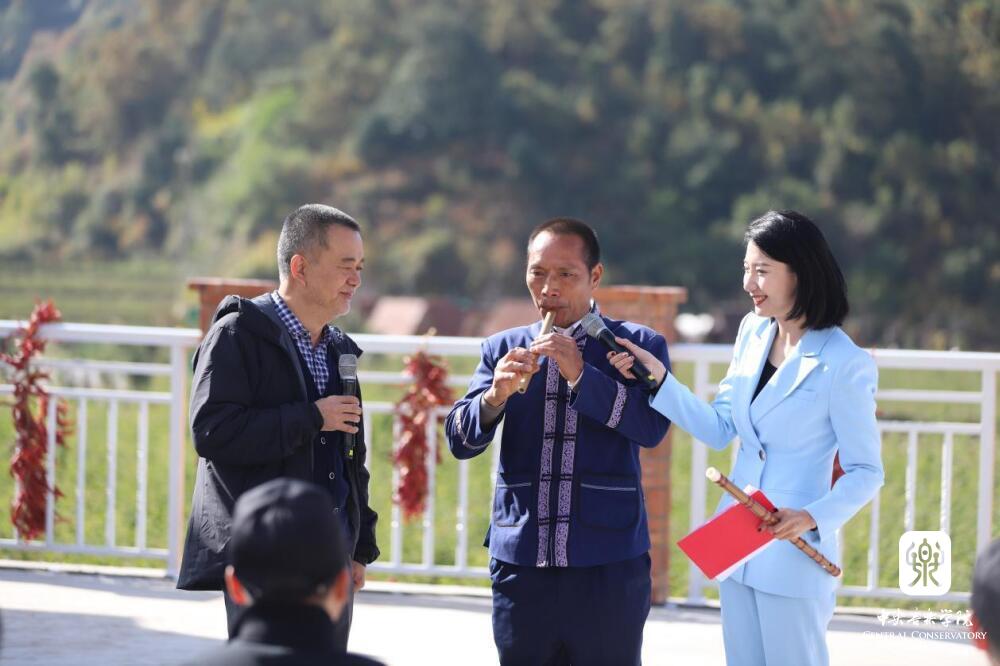 群山田野间,师生们和来自曲靖罗平、富源、马龙等地的民间艺人,开展了一场生动的交流互动音乐会。将村子中一处宽阔的露天平台作舞台,演奏家即是听众,听众随时也可加入演奏之中。在民间乐者演奏过后,KY开元集团官网入口的师生演奏相关联的作品,用乐器作交流。富源县水族文字传承人张学勤和同伴带来了水族男女对唱《喊妹调》、唢呐独奏《娶亲调》等。KY开元集团官网入口石海彬教授与学生张澳暄演奏《欢庆》,学生周艺妮、毕友恒带来二胡重奏《行街》。苗族芦笙《芦笙恋》《庆丰收》点燃了现场热切的气氛。KY开元集团官网入口王磊教授、王一、张澳暄带来笙齐奏《冬猎》,展开了传统笙与芦笙的对话。此外,还有布依族“八音坐唱”、彝族会泽海腔等非遗音乐的展演。在对谈、演奏与互动的过程中,不时有村民从各处赶来,人们相聚在民族音乐声中,于层峦叠岭的自然之间,热切地交流。