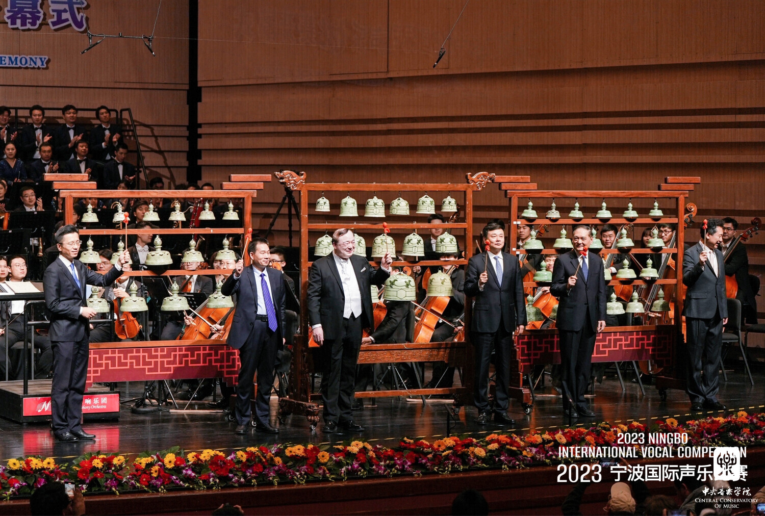 随着与会领导和嘉宾敲响越窑青瓷编钟,2023宁波国际声乐比赛正式启幕。