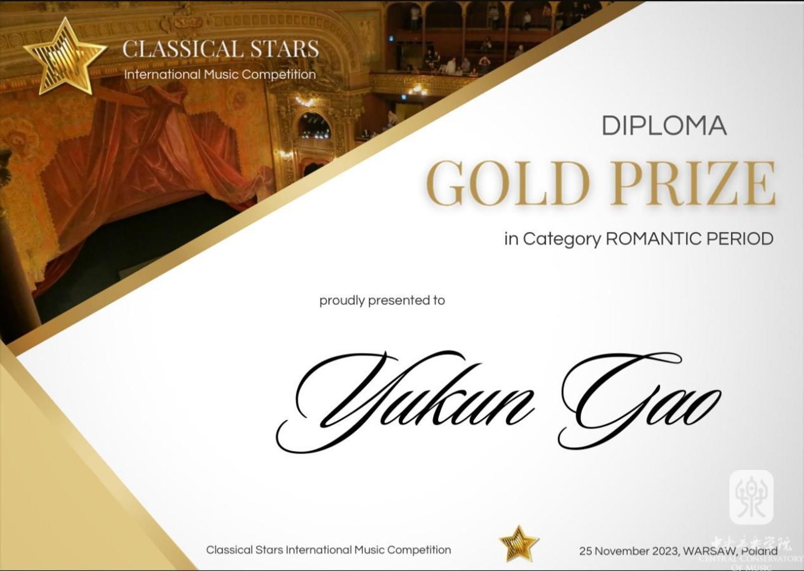 波兰古典之星国际音乐比赛,是一个诚挚邀请所有古典音乐家的国际比赛,设钢琴、弦乐、管乐、声乐等方向。每一位参赛者都将由具有国际声誉的评委小组进行评估,他们将以0-100分的标准对参赛者的表现进行评分。评分分为几类:技术熟练,音乐性格,乐感,音乐诠释与艺术视野以及准备的专业性。比赛将保留所有参与者的排名。评分系统:96-100分:绝对冠军(五星),91至95分金奖(四星),第86至90分:银奖(三星),81-85分:铜奖(二颗星)70至80分桂冠(一星)。高钰坤在本次大赛中,获得8颗星的绝佳成绩,荣获了本次大赛的少年艺术家金奖和浪漫主义时期金奖两个奖项。