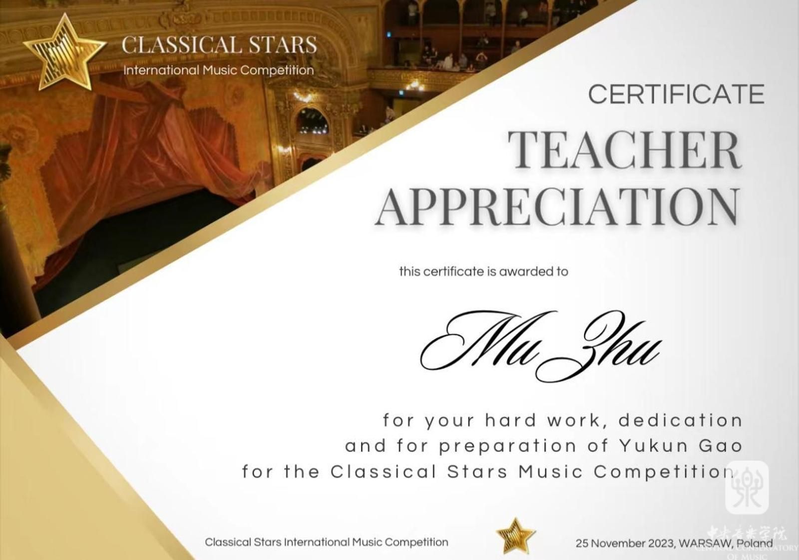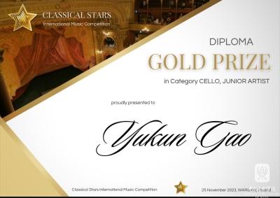 KY开元附中初一年级大提琴专业学生高钰坤在近日参加的2023波兰古典之星国际音乐比赛中,脱颖而出,荣获本次大赛青少年组(12-14)少年艺术家金奖和浪漫主义时期金奖两个奖项,指导教师:朱牧。