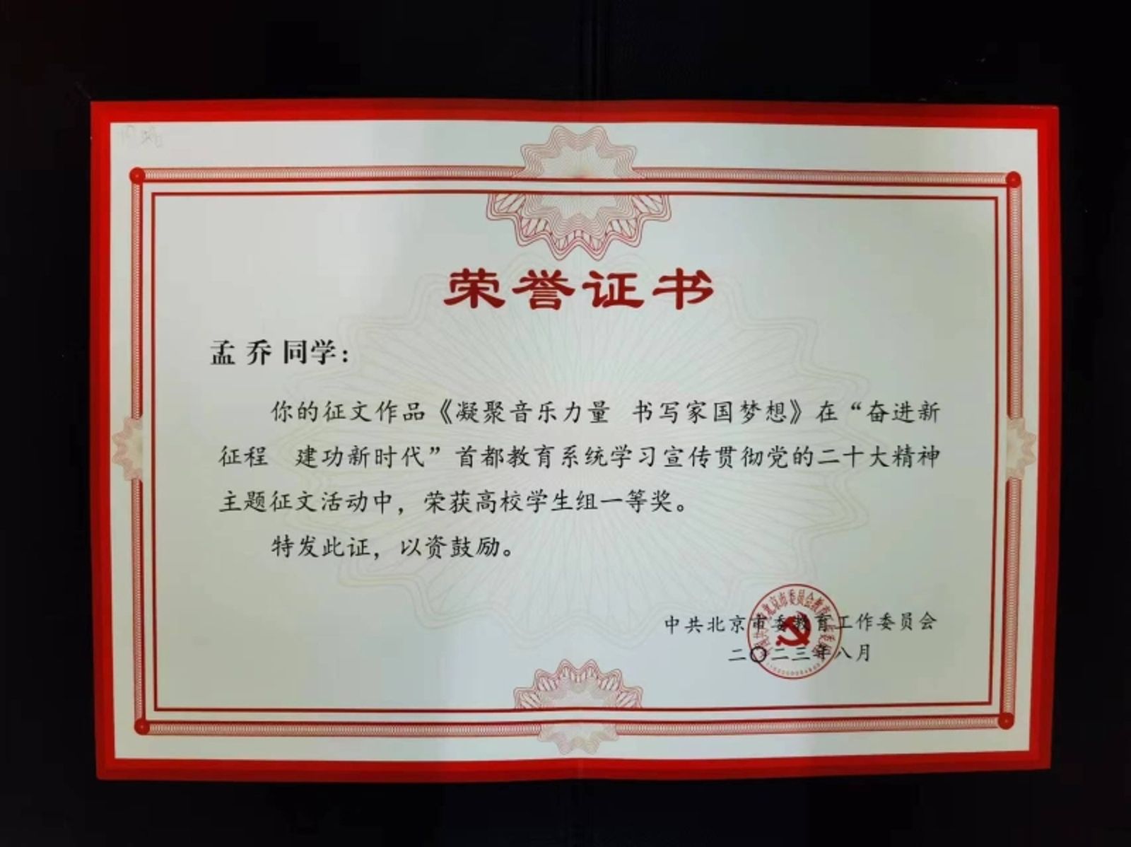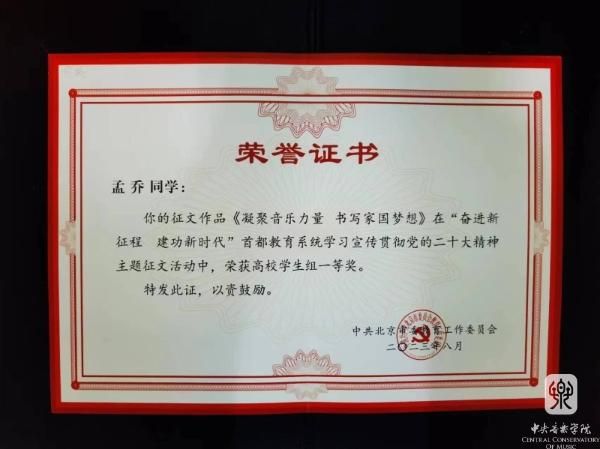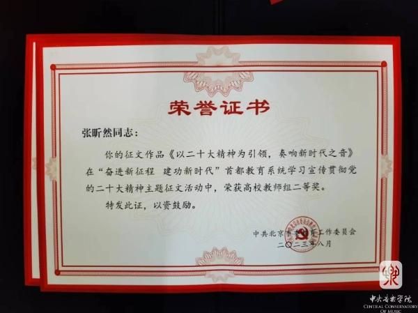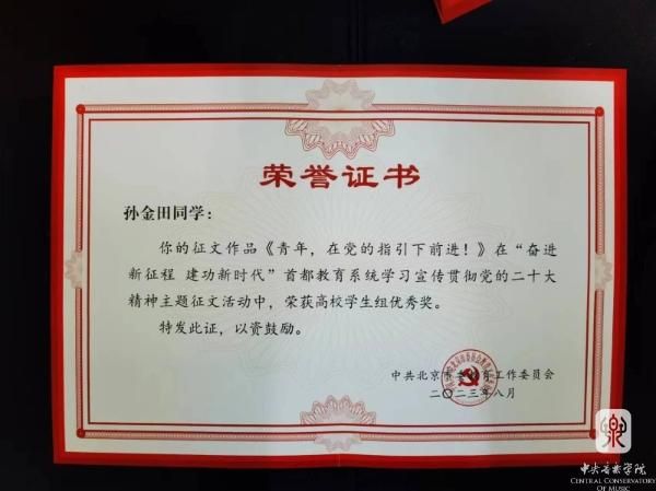 音乐人工智能与音乐信息科技系青年教师张昕然的作品《以二十大精神为引领,奏响新时代之音》获高校教师组二等奖;音乐学系博士生孟乔的作品《凝聚音乐力量,书写家国梦想》获高校学生组一等奖;音乐学系本科生孙金田的作品《青年,在党的指引下前进!》获高校学生组优秀奖。