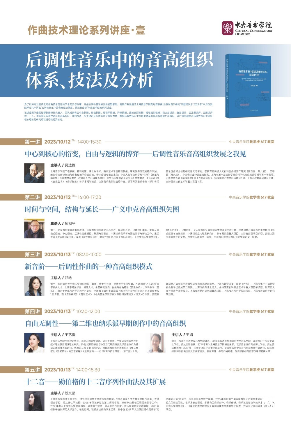 十场讲座针对后调性音乐音高体系的多个重要前沿理论的核心概念、运用方法、发展脉络、研究现状进行全面的阐述和梳理。回顾过往,理论家和研究者们在作品中提炼出与其相适应的、供分析使用的理论;时至今日,这些技术理论又继续在当代音乐的创作中为其提供源源不断的养分和动力。随着时间的推移、新作的涌现,音高理论势必会随之持续发展和完善,并不断显现出理论与创作的双向促进和互融。