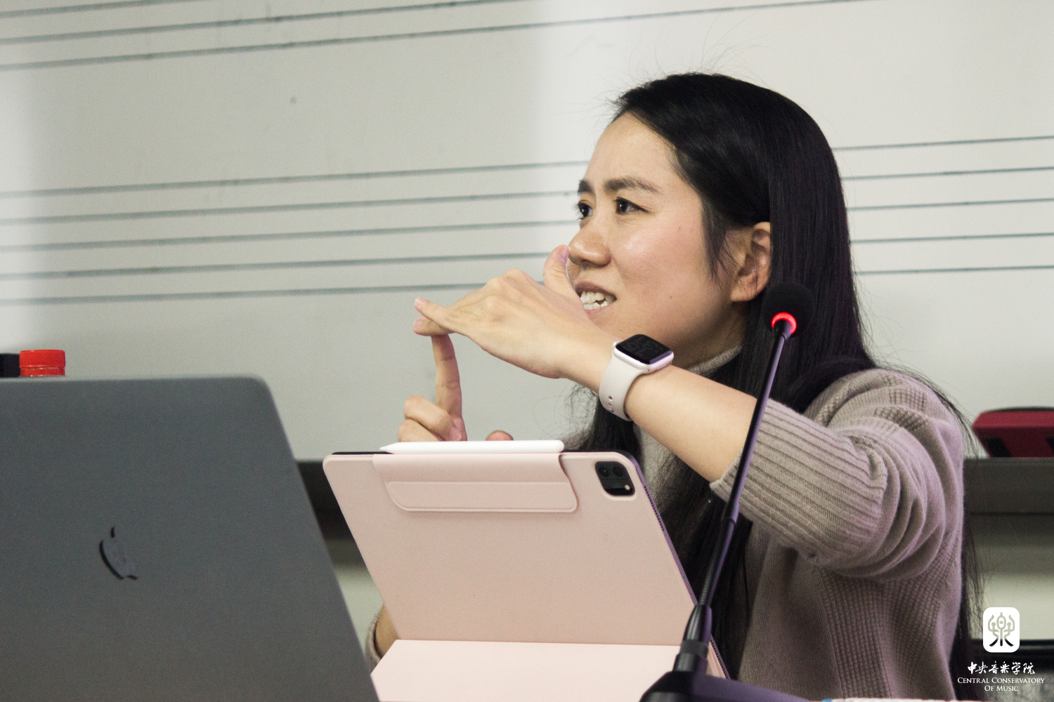 最后一场讲座由杨珽珽副教授带来“基于‘频谱’的音声结构研究”,杨老师解释了其标题中“音声”一词的含义,是为了强调“频谱”技术对后调性音乐中“音高”这一概念所进行的拓宽。与此同时,在分析频谱作曲家的作品时,就须关注“音声结构”这一概念。在对标题题眼解析后,杨老师开始对频谱音乐进行溯源,她梳理了频谱音乐产生时的社会背景(政治、科技等)和早期作曲家代表;电子时代的到来,数字化合成器与声音处理工具的更新迭代不断催生着频谱音乐创作观念的更新。随后,她集中阐释了缪哈伊(Tristan Murail)的“复杂声音”、“和声—音色”、格里塞(Gerard Grisey)的“乐器合成”、“声音的差异”等频谱作曲家的代表性理论及与其相对应的创作实例。最后她用格里塞的话以示总结:“频谱音乐中最根本的区别来自作曲家的态度,她们必须面对组成声音的聚集能量,以及这些能量出现所带来的时间。”