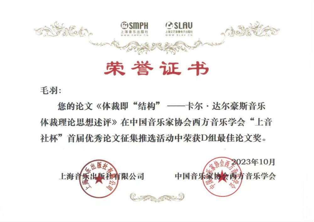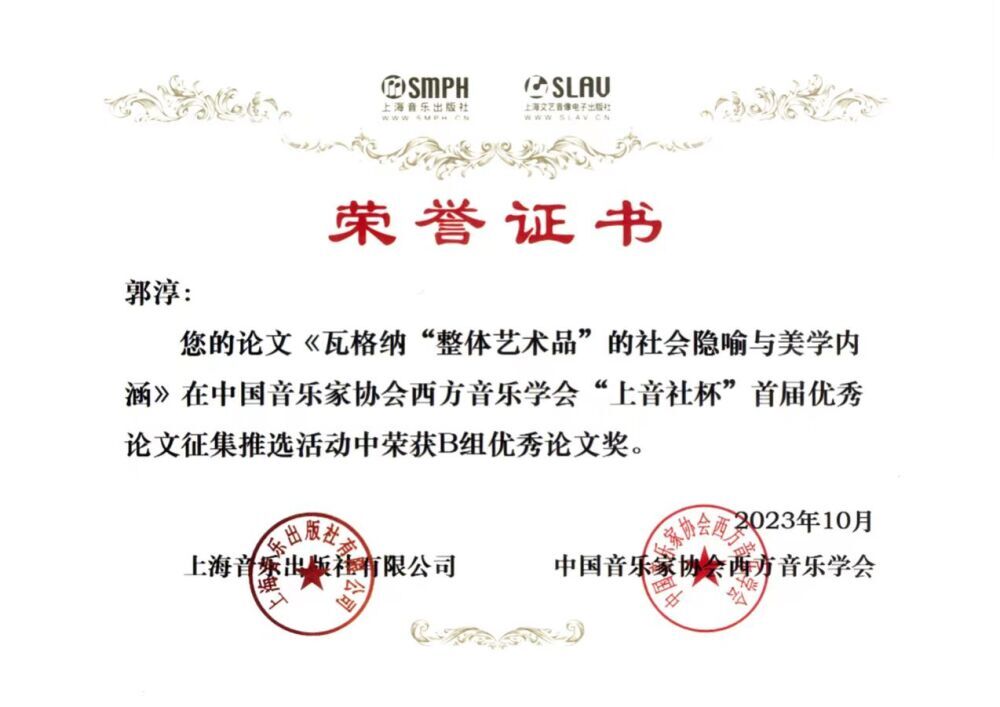 2023年10月,KY开元音乐学系西方音乐史专业师生在中国音乐家协会西方音乐学会“上音社杯”首届优秀论文征集推选活动中喜获佳绩。其中,教师毛羽的论文《体裁即“结构”——卡尔·达尔豪斯音乐体裁理论思想述评》荣获D组最佳论文奖;2023级博士研究生郭淳的论文《瓦格纳“整体艺术品”的社会隐喻与美学内涵》(指导教师:潘澜教授)荣获B组优秀论文奖。