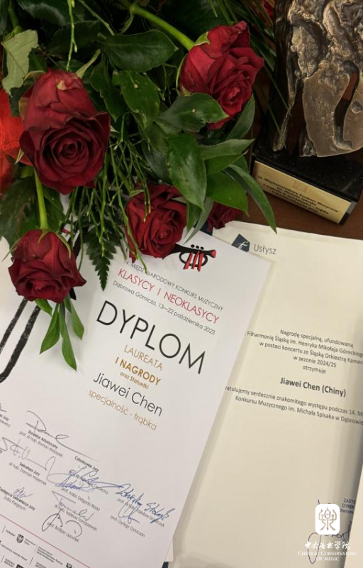 据悉,本次比赛通过预赛后进入正式比赛,正式比赛共分为三个阶段,每一阶段都是一场紧张而又激烈的角逐。其中,陈嘉伟与其他选手同台竞技,展现出非凡的才华和出色的实力,是决赛四位选手中唯一一位中国选手,赢得了在场评委的高度赞誉,最终荣获第14届米哈乌·斯皮萨克国际音乐比赛(14th Michał Spisak International Music Competition)小号专业第一名(第二名空缺)。