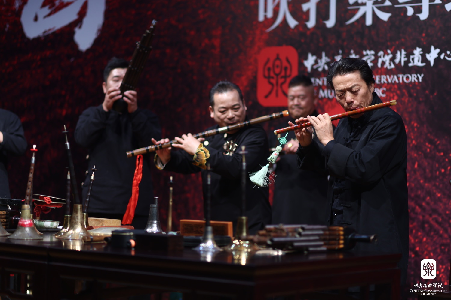 接下来的《小开门》由大小笛子及笙配合演奏,风格典雅悠扬。周本鸣使用笛子领奏,展现了民间传承人一专多能的特点。