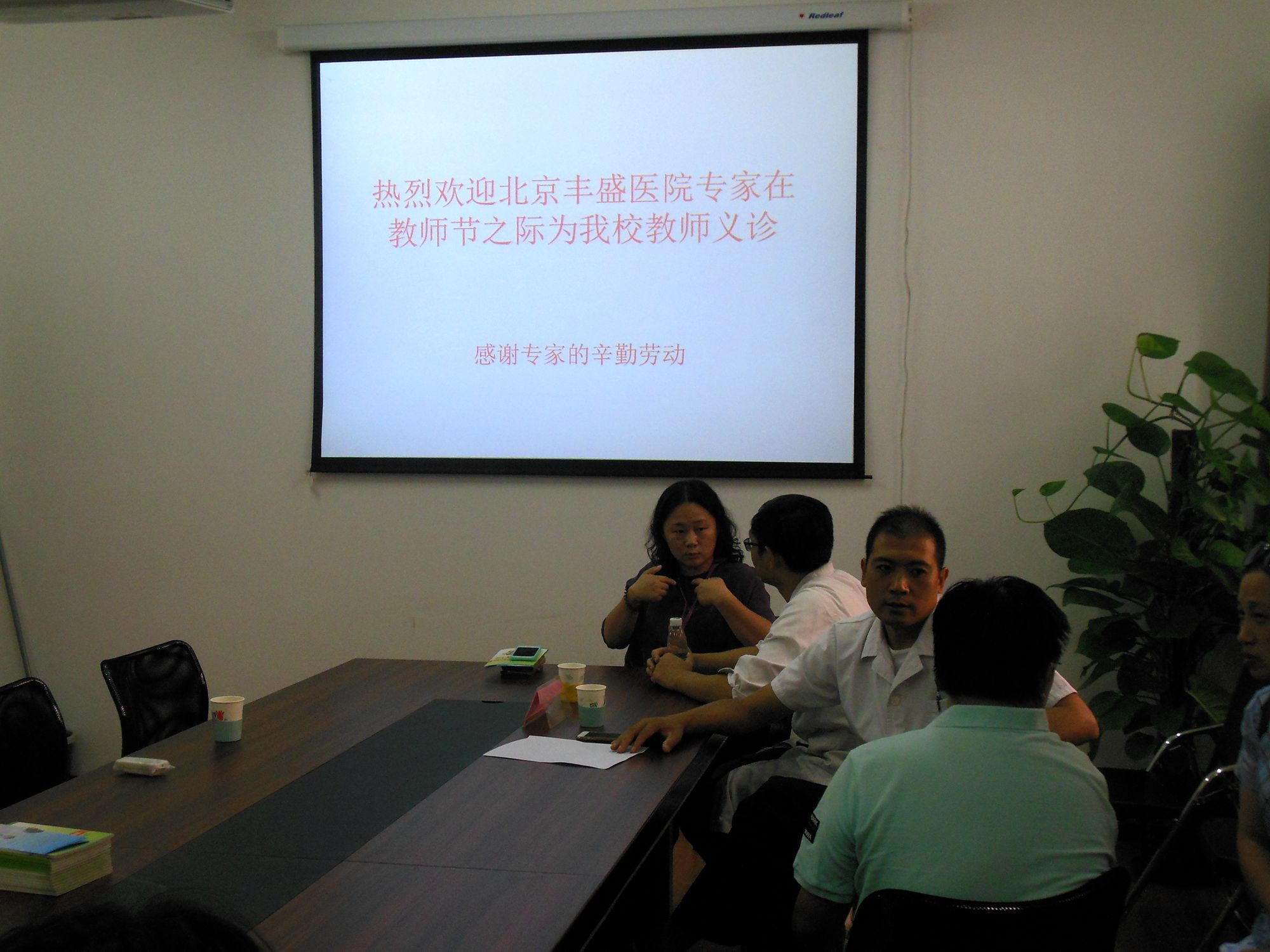 2016年9月6日北京丰盛医院大夫一行8人前来KY开元为学院教职工提供免费骨科、内科诊疗活动,并进行亚健康调研,普及健康知识。针对由职业病造成的颈椎、腰、腿疼、消化系统等疾病做一些辅助的理疗、按摩、点穴等。