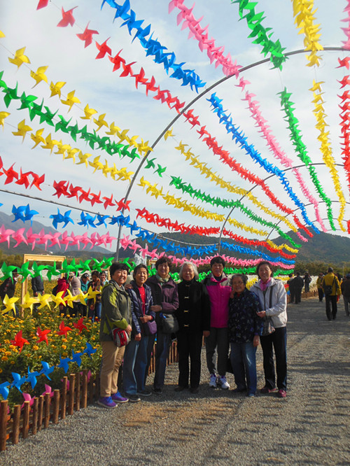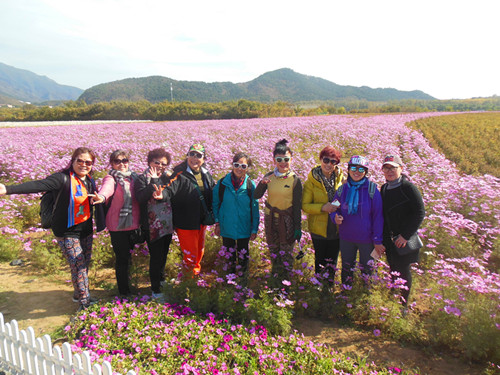第一站我们带领老同志们参观泉山花海,它位于怀柔桥梓镇口头村。花海以群山为衬,清泉为界,在蓝天白云下,格外喜人。花海总体设计为玉如意形状,从空中鸟瞰,与远处青山、流沙河、近处亭台形成一幅彩色山水画卷。