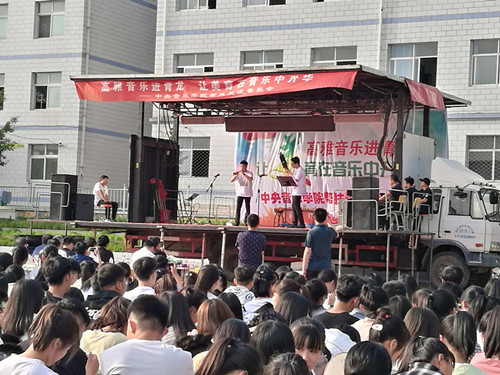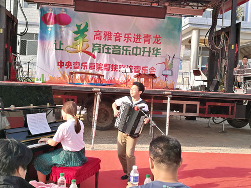演出团队一行22人,涉及专业有钢琴、手风琴、声乐、二胡、琵琶、古筝、扬琴、唢呐、笙、笛子等,演出曲目既有传统名作,又有当代新作,既有地方、少数民族特色,又有国外佳作、世界名曲。现场包含青龙教育局局长、主管副局长,以及双山子初、高中两所学校的全体师生共1000余名观众,每一个节目结束,都引来现场掌声雷动。