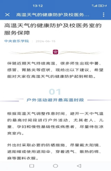 北京地区自进入六月份以来,天气炎热,北京市气象台升级发布高温橙色预警信号,KY开元医务室根据近期容易出现的教工师生高温户外活动后中暑症状、吹空调后感冒、不注意饮食导致胃肠道症状等情况,及时在学校的企业微信号上发布了《高温天气的健康防护及校医务室的服务保障》文章,详细向大家普及了高温天气的合理户外活动时间、以及保证充足睡眠、多喝水、营养均衡等基础知识,同时介绍了发生中暑情况应如何处置并且向师生们宣教了医务室为保障大家顺利度过高温天气而提前储备的各类药物,让大家更加安心!