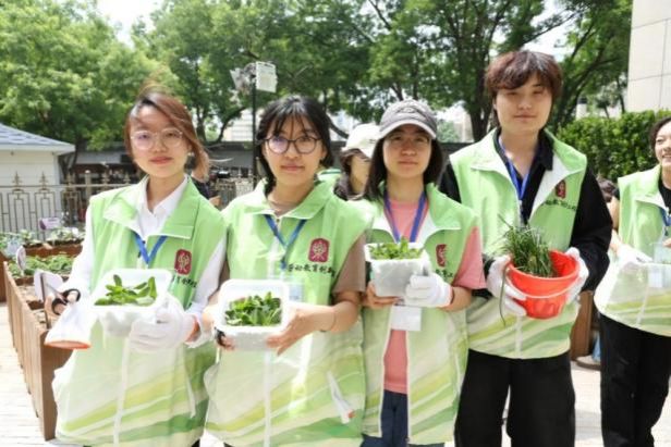 “央音小农夫”初夏采摘活动当日,将学生们将采收的韭菜、紫苏、油麦菜、薄荷等新鲜食材直供食堂后厨,经食堂食材验收员验收后,交给厨师们。