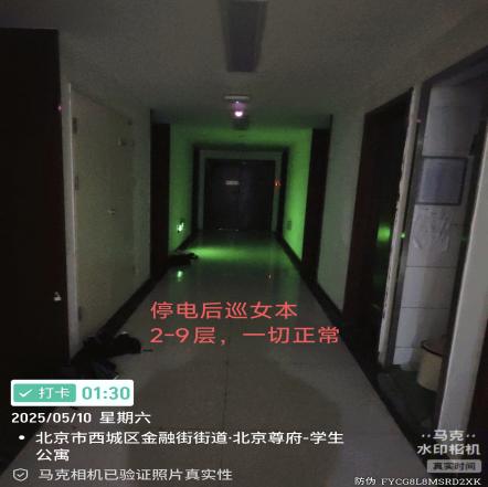 停电后工作:00:54分正式断电,停电后每2小时值班老师逐一楼层进行巡视,确保楼内无使用明火照明的情况。