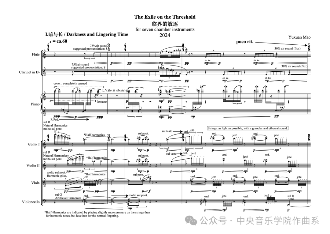 《临界的放逐》以自然临界状态下的不同场景为意象,共有六个子标题的段落,分别是:“暗与长”、“盗火”、“裂口”、“温河间奏”、“河床追捕”、“满天星”,作曲家通过这些被陌生化的非现实意象激活起感官与想象,并逐步用音响串联出线索,以唤起某种自然与个人感受在创作中的同怀与化合。