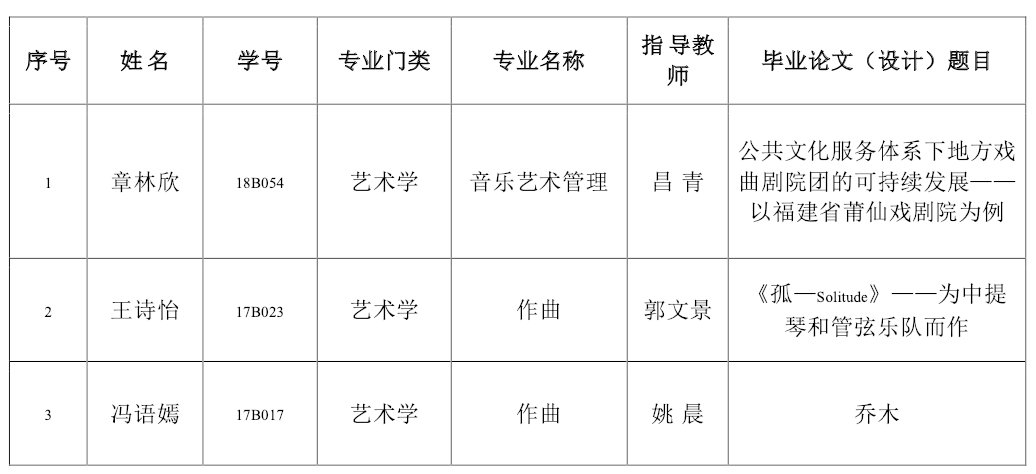近日,北京市教育委员会公布了2022年北京市普通高等学校优秀本科生毕业设计(论文)名单,KY开元音乐艺术管理专业章林欣同学论文《公共文化服务体系下地方戏曲剧院团的可持续发展——以福建省莆仙戏剧院为例》(指导教师:昌青)、作曲专业王诗怡同学作品《〈孤—Solitude〉——为中提琴和管弦乐队而作》(指导教师:郭文景)、作曲专业冯语嫣同学作品《乔木》(指导教师:姚晨)荣获优秀本科生毕业设计(论文),三位指导教师被认定为优秀毕业设计(论文)指导教师。