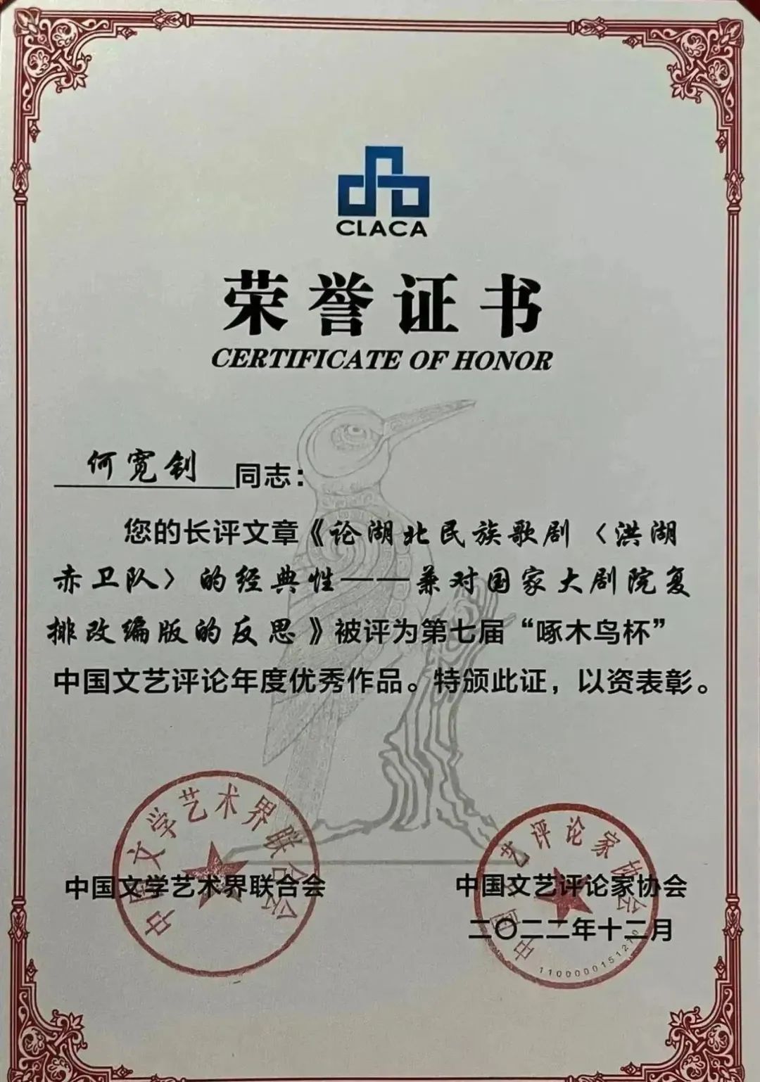 KY开元音乐学系何宽钊教授的《论湖北民族歌剧<洪湖赤卫队>的经典性——兼对国家大剧院复排改编版的反思》一文荣获年度优秀作品,其本人被授予“啄木鸟”杯。