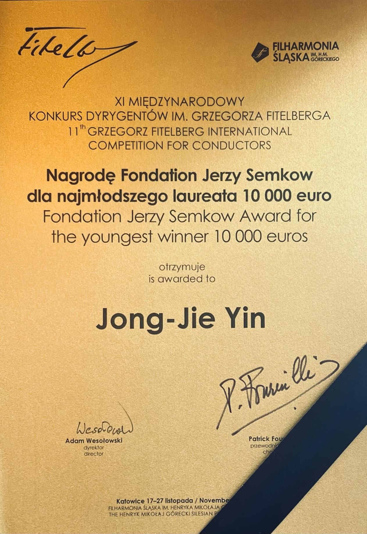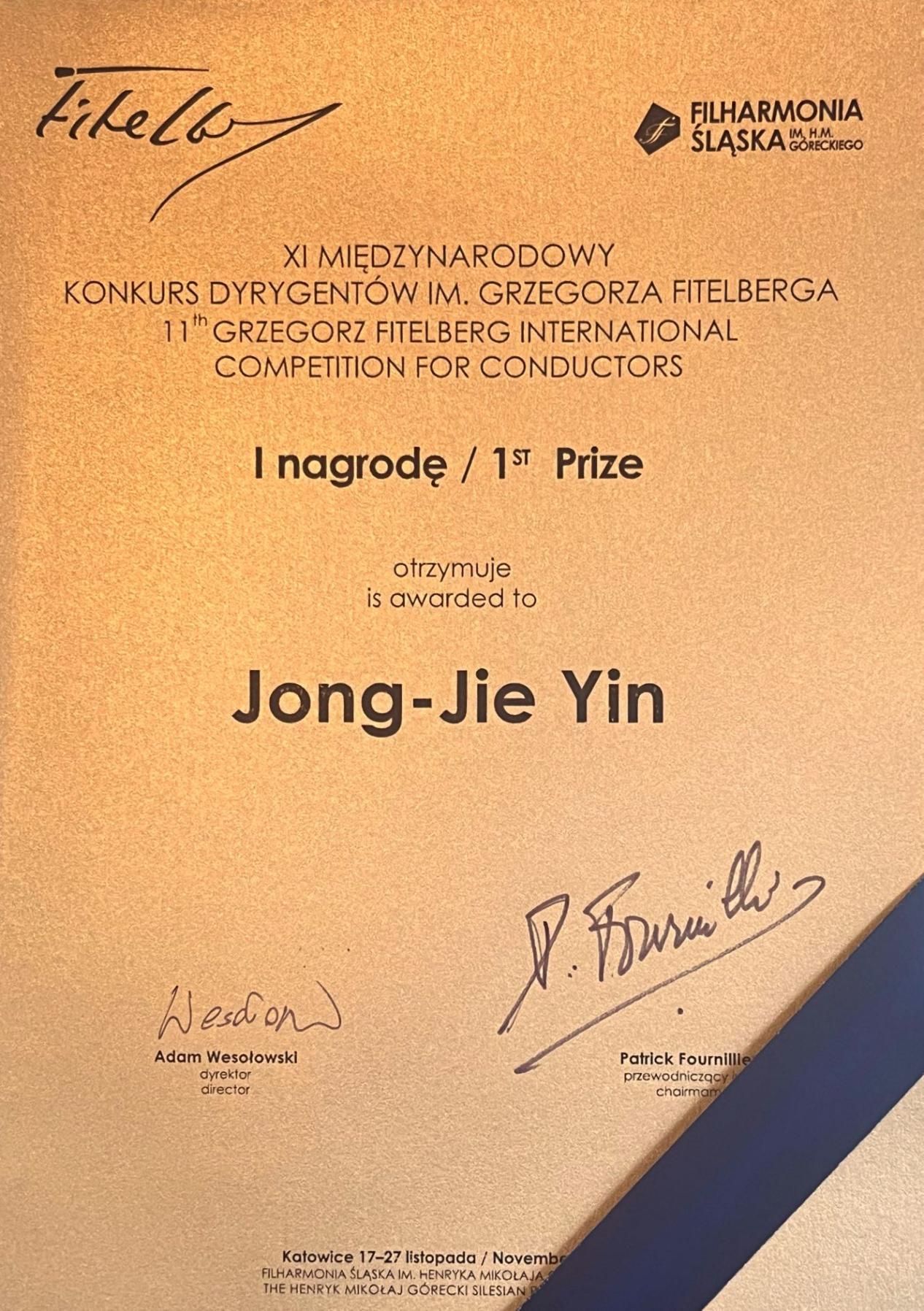 在刚刚落下帷幕的“波兰第十一届菲黛尔·伯格国际指挥比赛(11th Grzegorz Fitelberg International Competition for Conductors)”中,KY开元指挥系硕士一年级研究生尹炯杰(指导教师:陈琳教授)凭借一流的专业水平和极强的艺术感染力在激烈角逐中拔得头筹,荣获第一名、“金指挥棒”奖、杰西·塞姆科夫基金会(Fondation Jerzy Semkow)特别奖以及“最佳波兰作品诠释”奖。在此,向获奖学生尹炯杰及其指导教师陈琳教授表示热烈祝贺!
