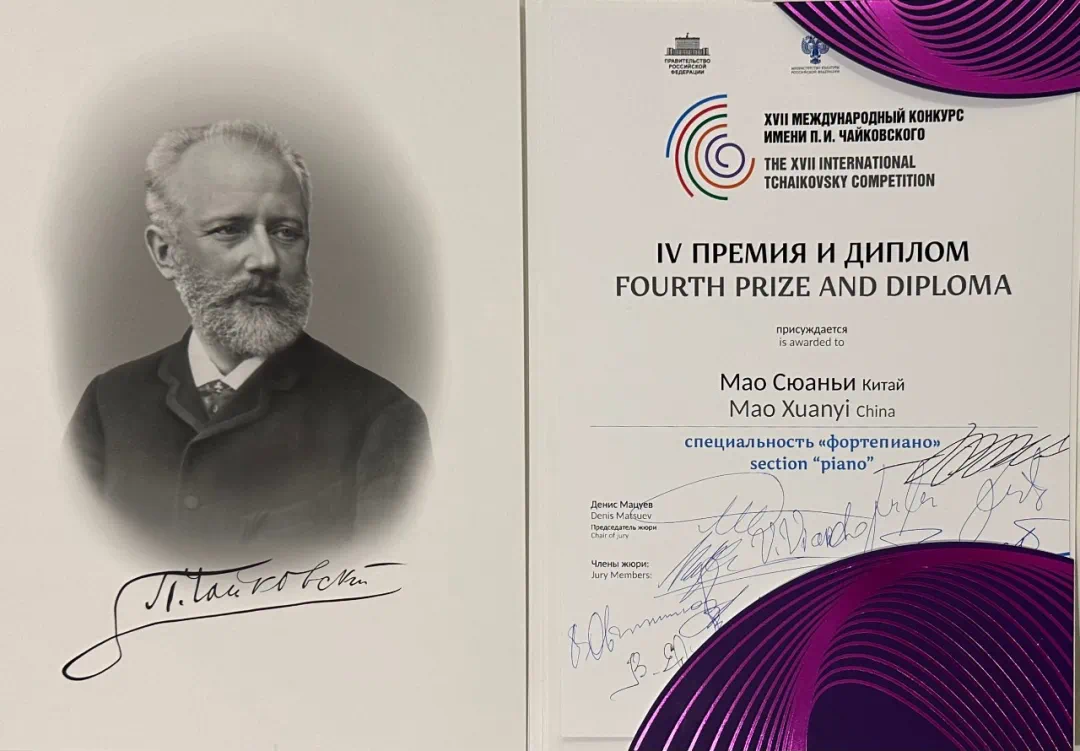当地时间2023年6月30日,第17届柴可夫斯基国际音乐比赛大奖出炉,由我系从本科起自主培养的毛宣懿同学(分别跟随吴迎、赵聆教授学习,目前跟随韦丹文教授攻读博士学位)凭借精湛的演奏技艺,稳定的发挥,获得钢琴组第四名。