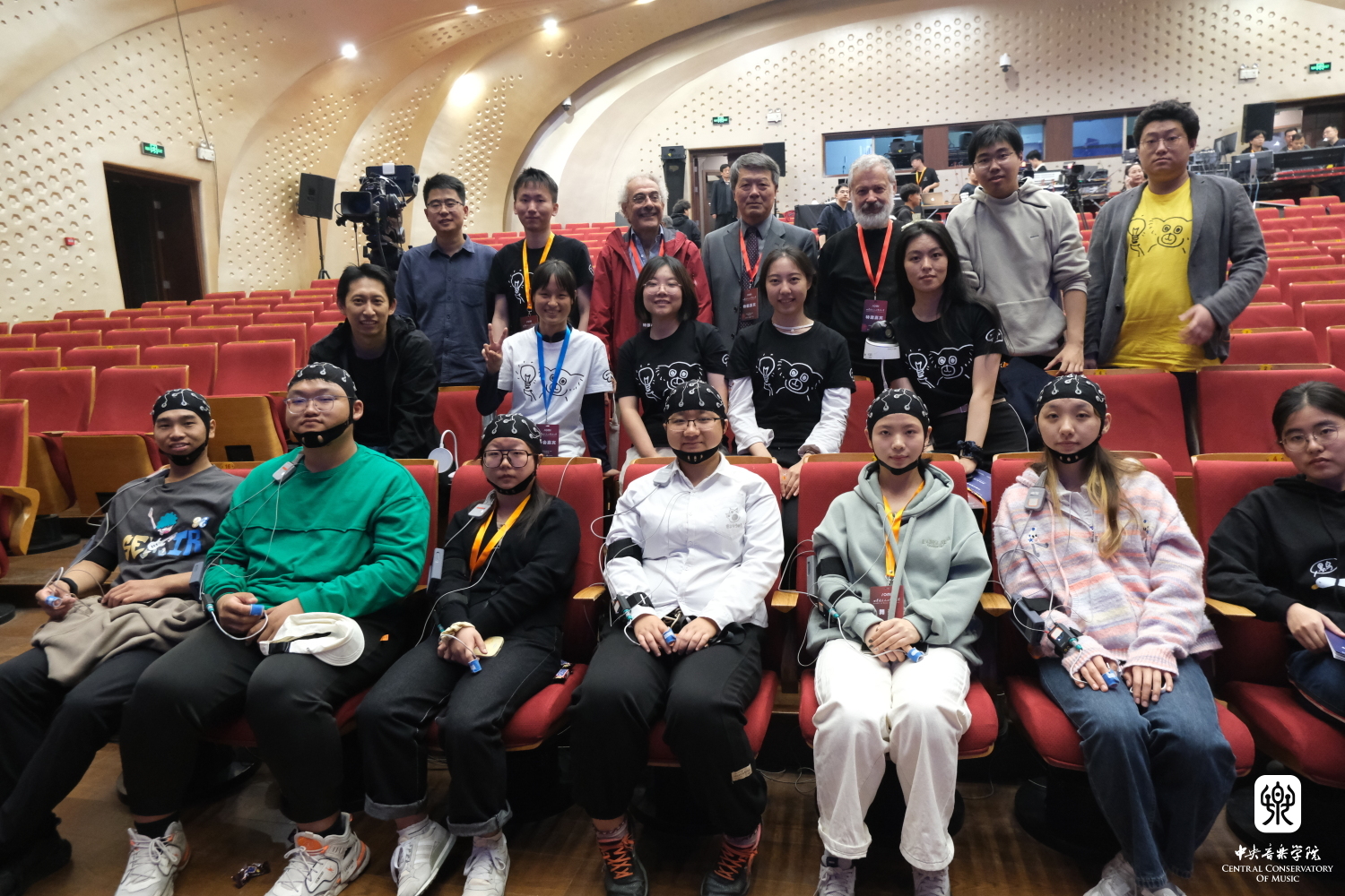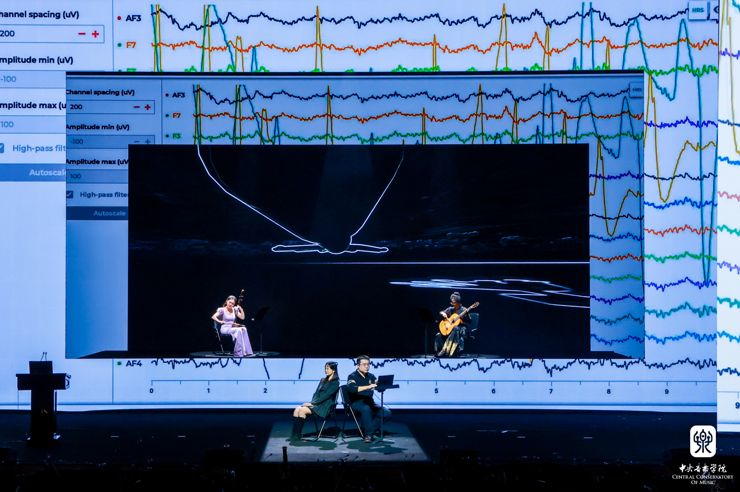音乐会进行中,王小勤教授带领央音音乐与脑科学实验室团队在现场开展了一次实景音乐脑科学实验,实验团队由KY开元集团官网入口与清华大学脑与智能实验室合作建立。团队邀请了6位受试者作为观众,实时记录并展示受试者在观赏现场表演时的脑电和生理数据,并将在后续实验中对数据进行分析。