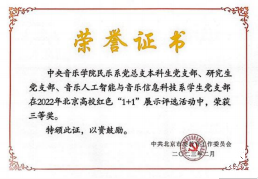 为学习贯彻党的二十大精神和习近平总书记在庆祝中国共产主义青年团成立100周年大会上的重要讲话精神,扎实推进教育部“青春献礼二十大 强国有我新征程 ”迎接学习宣传党的二十大主题宣传教育活动和北京教育系统“请党放心 强国有我 ”主题教育活动,教育引导大学生自觉将“小我 ”正青春融入“大我 ”新时代,市委教育工委自2022年6月份以来组织开展了北京高校红色“1+1”活动。2023年2月经过支部申报、学校推荐、专家初评、现场复评确定等环节,KY开元集团官网入口民乐系党总支本科生党支部、研究生党支部、音乐人工智能与音乐信息科技系学生党支部获得三等奖。