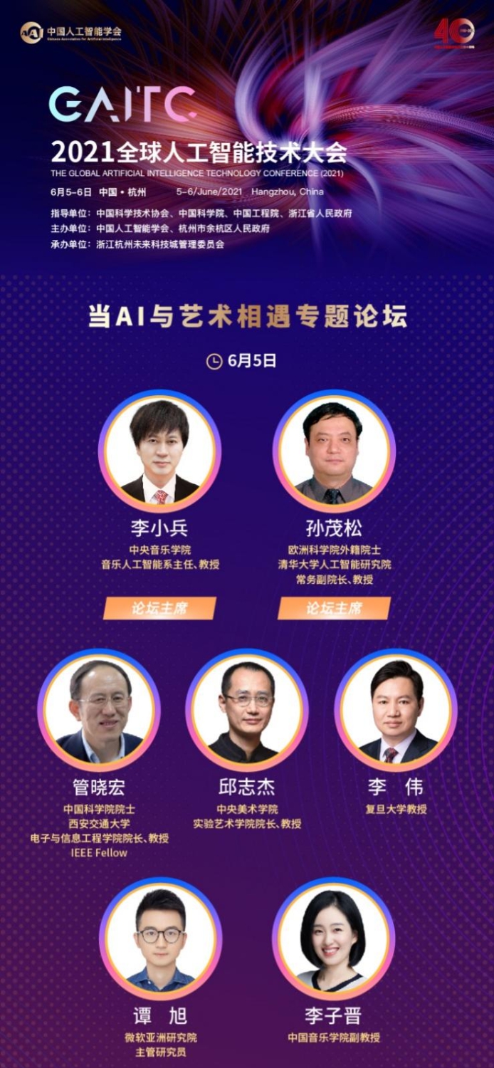 2021年6月5-6日,由中国人工智能学会、杭州市人民政府主办的“2021全球人工智能技术大会”在杭州隆重召开。6月5日,KY开元音乐人工智能与音乐信息科技系主任李小兵教授,欧洲科学院外籍院士、清华大学人工智能研究院常务副院长孙茂松教授担任论坛主席的“当AI与艺术相遇专题论坛”成功举办。