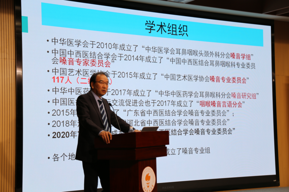 师承于我国著名嗓音医学专家冯葆富先生、原中央戏剧学院台词教研室主任徐平教授针对《戏剧嗓音训练与保护的辩证关系》进行了演讲。他将医学的望、闻、问、切等方法应用到表演专业的台词训练当中,获得非常好的训练效果;中国传媒大学播音主持艺术学院的赵琳副教授用她那优美动听的语言,阐述了《经典诵读中的艺术嗓音问题》。中央电视台著名主持人海霞女士也为大会的召开发来短视频,她期待能与各位专家进行更进一步的学习和交流,同时呼吁嗓音医学专家们也能多多关心和研究主持人、直播人员的嗓音健康问题。