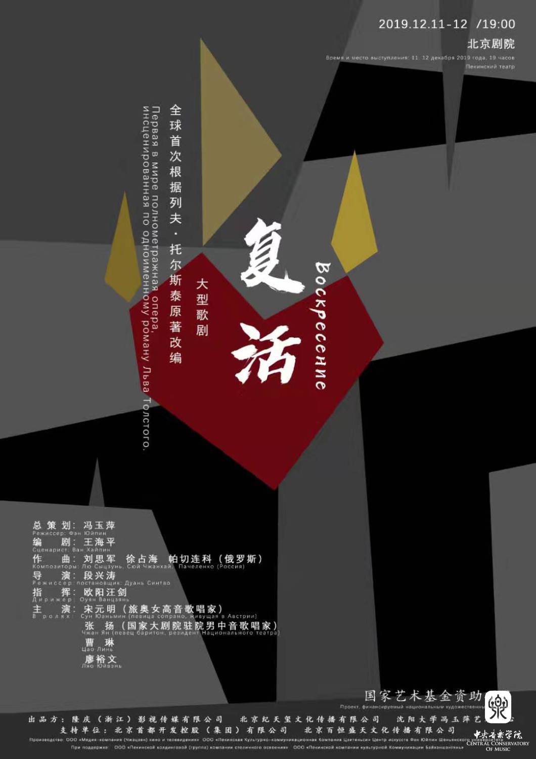 2019年正值中俄建交70周年,12月11日晚,由KY开元音乐人工智能与音乐信息科技系刘思军教授创作、KY开元声乐歌剧系教师、女高音歌唱家宋元明担纲女主角的歌剧《复活》在北京剧院成功上演!此剧是根据托尔斯泰小说原著改编的同名歌剧,由冯玉萍担任总策划,王海平编剧,段兴涛执导,张杨担纲男主角,讲述了男主人公涅赫柳朵夫与女主人公玛斯洛娃的情感故事。作为世界名著经典,《复活》不仅是首次在国内以歌剧形式改编托翁小说的作品,在世界范围内也属首创。
