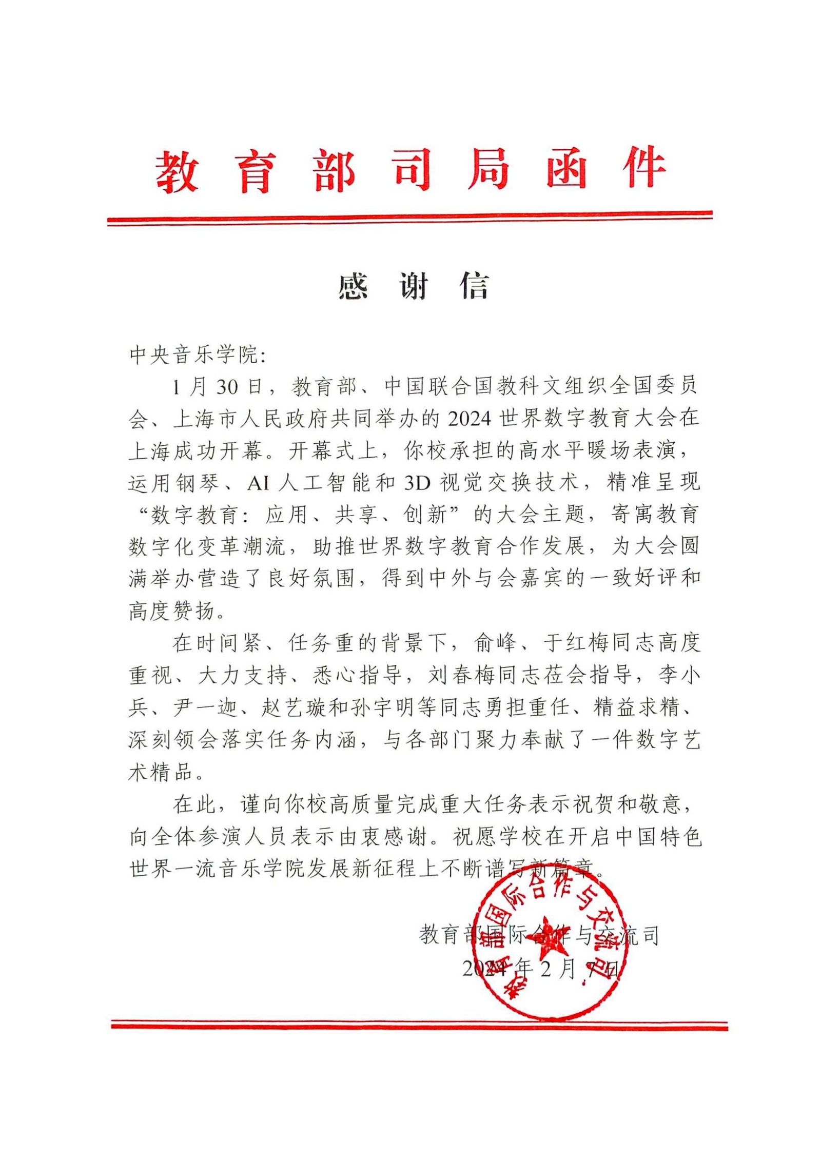 此次演出是KY开元第二次受邀参加世界数字教育大会开幕式,是对KY开元卓越艺术水准和创新能力的又一次集中展示。这份感谢信凝聚着对KY开元音乐人工智能系研究成果的认可,更是对KY开元在音乐教育领域取得成就的一种鼓励和支持,它鼓舞着我们继续前行,为推动中国音乐教育的创新和发展贡献自己的力量。