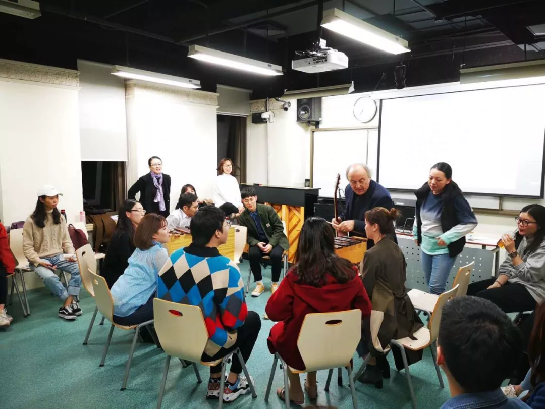 首先,Nolan教授邀请两组同学进行器乐合奏,鼓励同学们互相聆听、关注当下感受并在演奏后进行交流与分享。