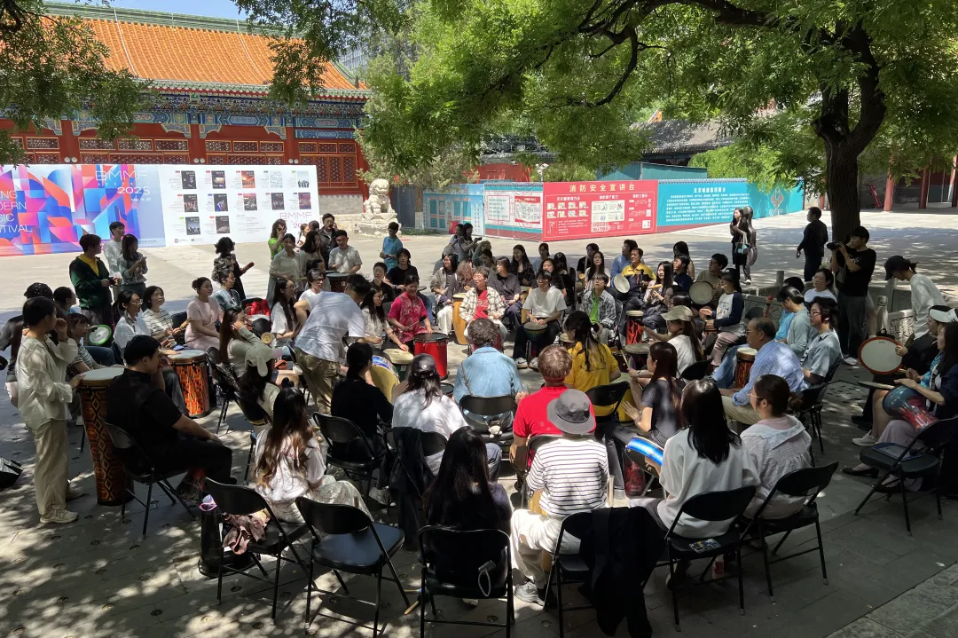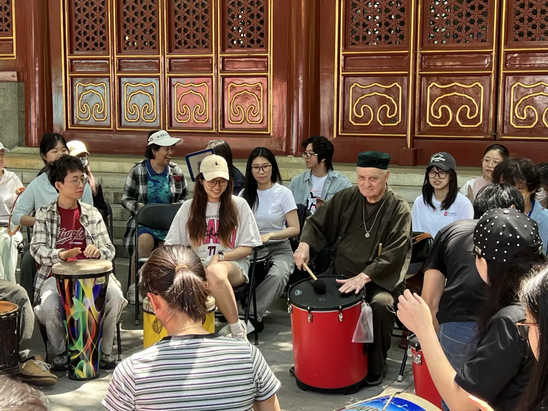 5月19日中午,校园里回荡着充满生命力的节奏。享誉全球的“鼓圈之父”Arthur Hull亲领的团体鼓圈体验活动在王府音乐厅前广场圆满举办,百余名师生热情参与。该活动由中国鼓圈先行者中央民族大学张弩老师、KY开元音乐治疗专业刘明明老师共同带领。