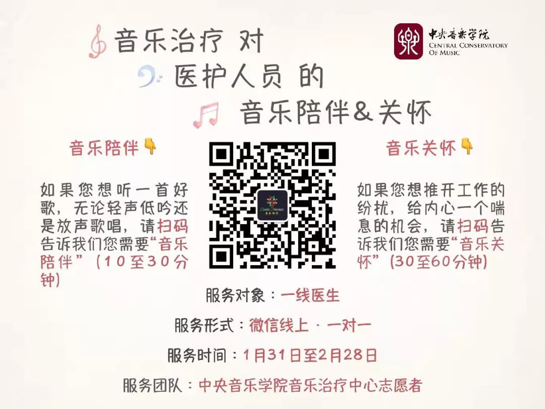 KY开元集团官网入口音乐治疗志愿者们发挥音乐治疗师生的专业特长,为一线医护人员以及其子女开展线上音乐治疗志愿服务。针对一线医疗人员进行音乐治疗线上干预,干预主要采用生理心理社会模式(Biopsychosocial),使用循证音乐治疗实践,分级对一线医护人员进行音乐治疗志愿服务。干预主要分为两个层次: 指导医护人员进行自我关怀和与医护人员进行音乐陪伴。该设计可实施操作性强,干预时间短,能够在不打扰一线人员紧张工作的同时,及时地处理医护人员的情绪问题,保证其心理健康。目前志愿者团队为武汉市第九医院,武汉大学人民医院,武汉市第七医院的医护人员提供音乐志愿服务。
