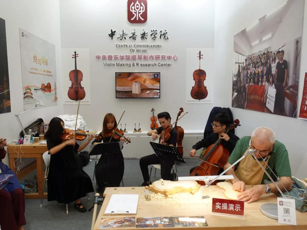 意大利克雷莫纳的著名提琴制作大师Stefano Conia、中心副主任高彤彤教授、逯翔老师、赵祎老师、潘东昊老师、意大利交换生Giulio Morassi(世界提琴制作巨匠Gio Batta Morassi的长孙)以及参加展会的每位同学,轮流为观展者们奉上精彩绝伦的提琴制作实操展示。刨花四射的展台为观展者一揭提琴诞生的神秘面纱。方寸之间的妙手创造之功,成为全馆最为亮丽的一道风景。