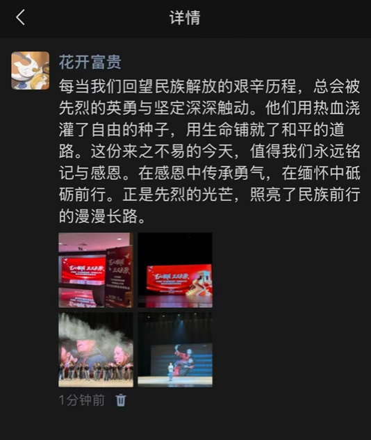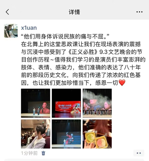 活动现场,纪念活动策划设计部副部长、广场活动部副部长肖向荣,《正义必胜》总导演周莉亚、韩真等20余名师生代表被聘为宣讲团成员,结合参与纪念抗日战争胜利80周年系列活动的亲身经历,分享台前幕后故事,进一步推动抗战胜利80周年纪念活动中激发的深刻体悟与创作热情,转化为潜心艺术创作的扎实行动。公开课中穿插文艺晚会《正义必胜》选段《血染的白桦林》《乘风》《怒吼吧,黄河》的表演,师生重温了激情澎湃的活动场景,在共情共鸣中汲取伟大抗战精神的激励力量,让艺术因使命而璀璨,梦想因担当而辉煌。