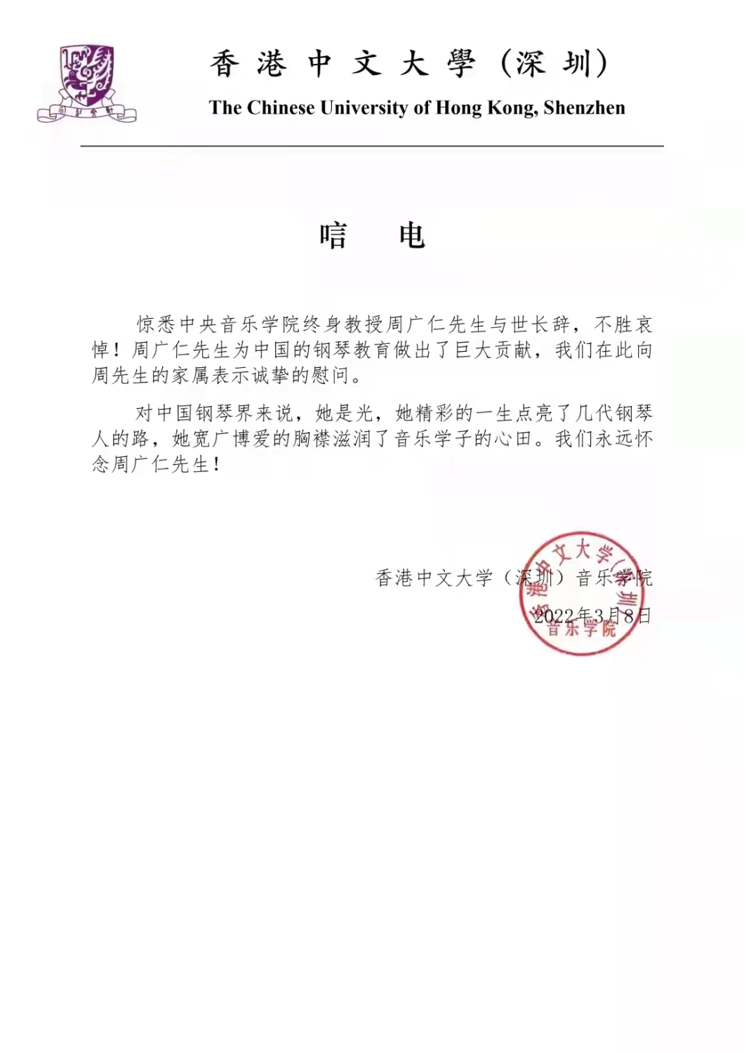 香港中文大学(深圳)致唁电 悼念周广仁先生
