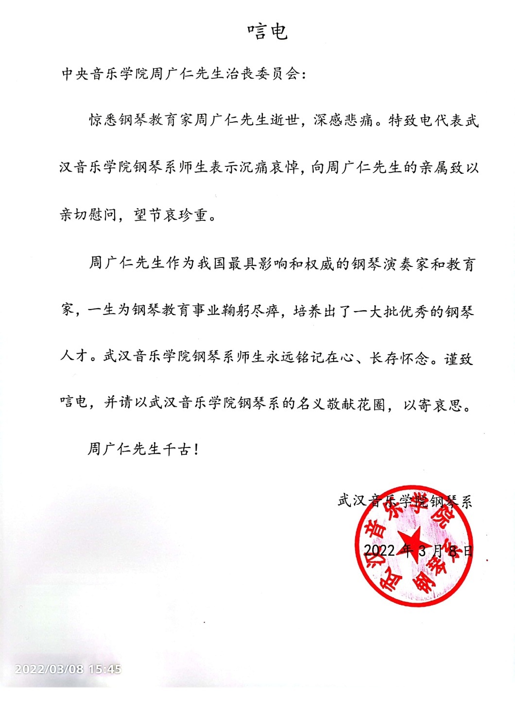 武汉音乐学院钢琴系致唁电 悼念周广仁先生