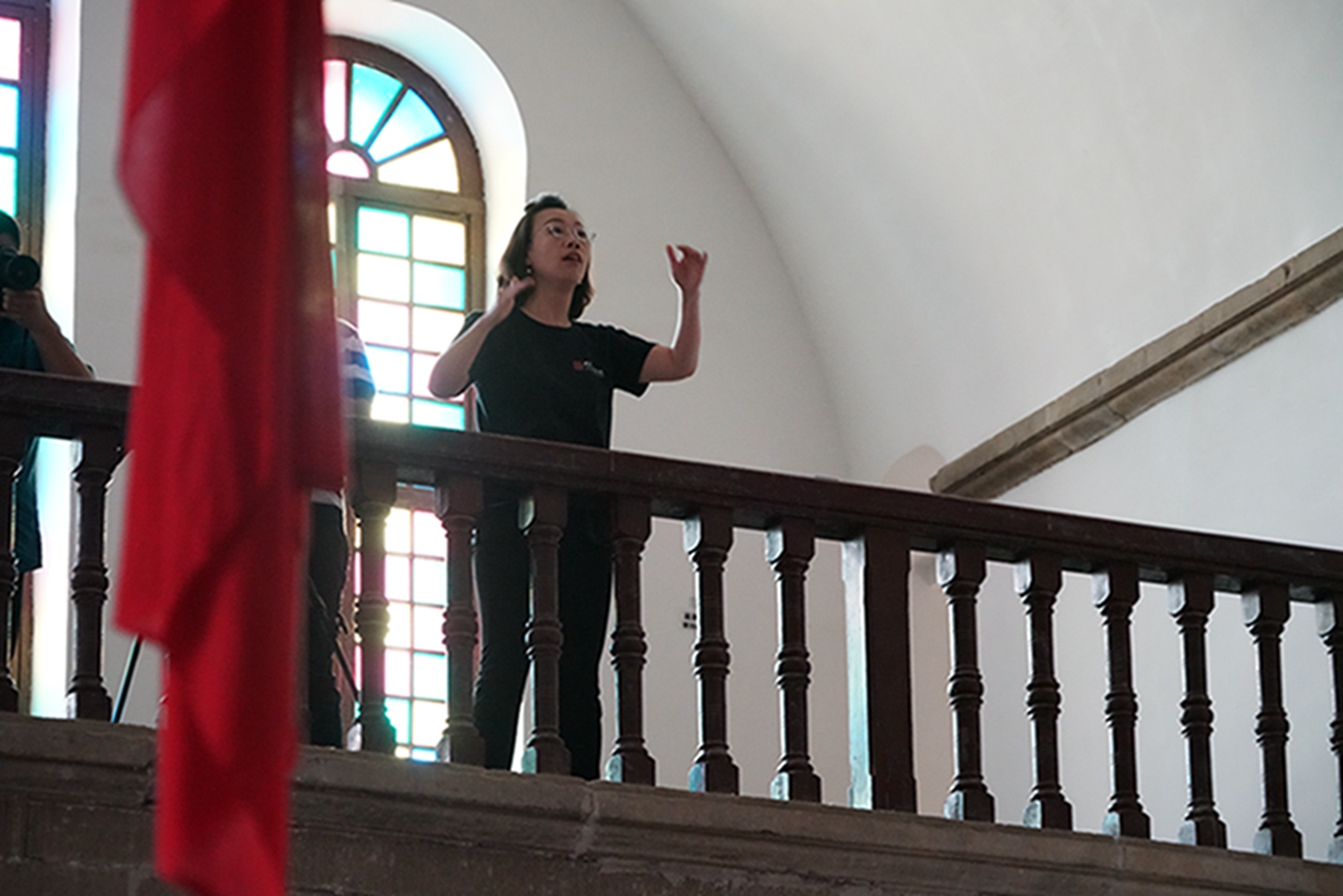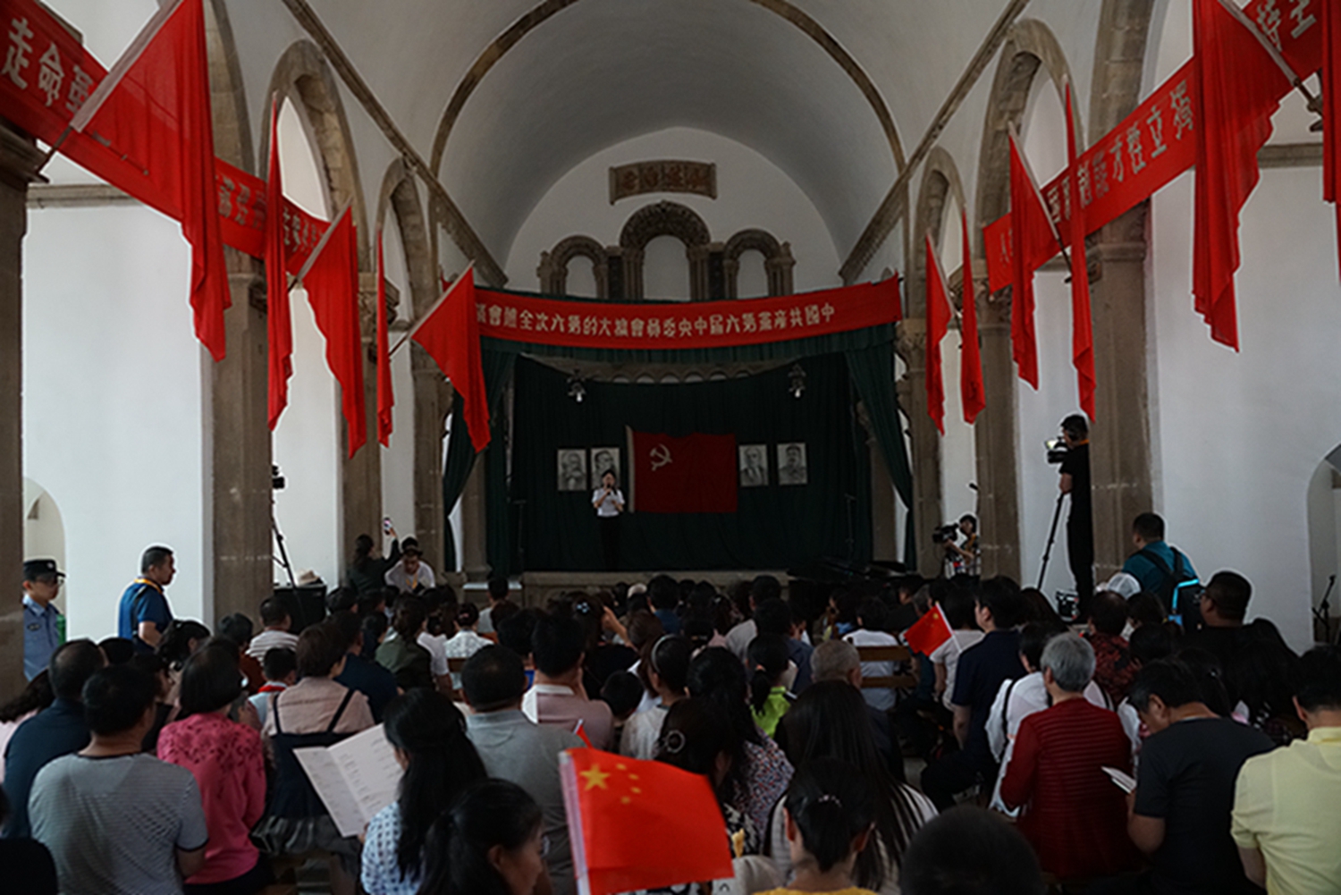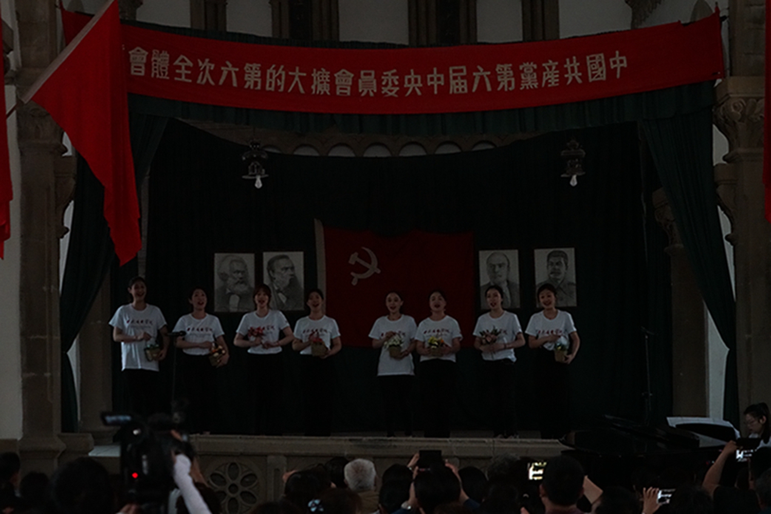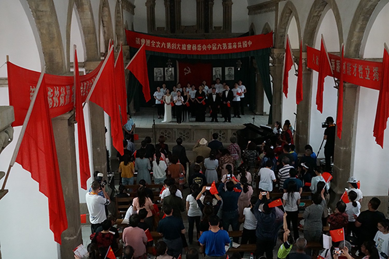 尤其值得一提的是,音乐会是在鲁艺旧址的大教堂举行,这是这座教堂时隔74年(延安鲁艺1945年迁往东北)以来的首次演出。这栋建筑历经风雨战火,墙体剥蚀,铺地灰色的青砖坑坑洼洼变成黄土色,然而当嘹亮的歌声灌满整个厅堂、在红色的横幅中激荡,庄严神圣的革命情怀油然而生,让人立时热泪盈眶。