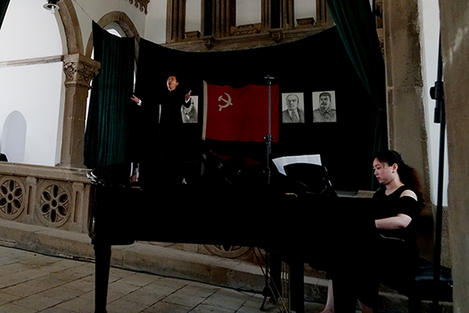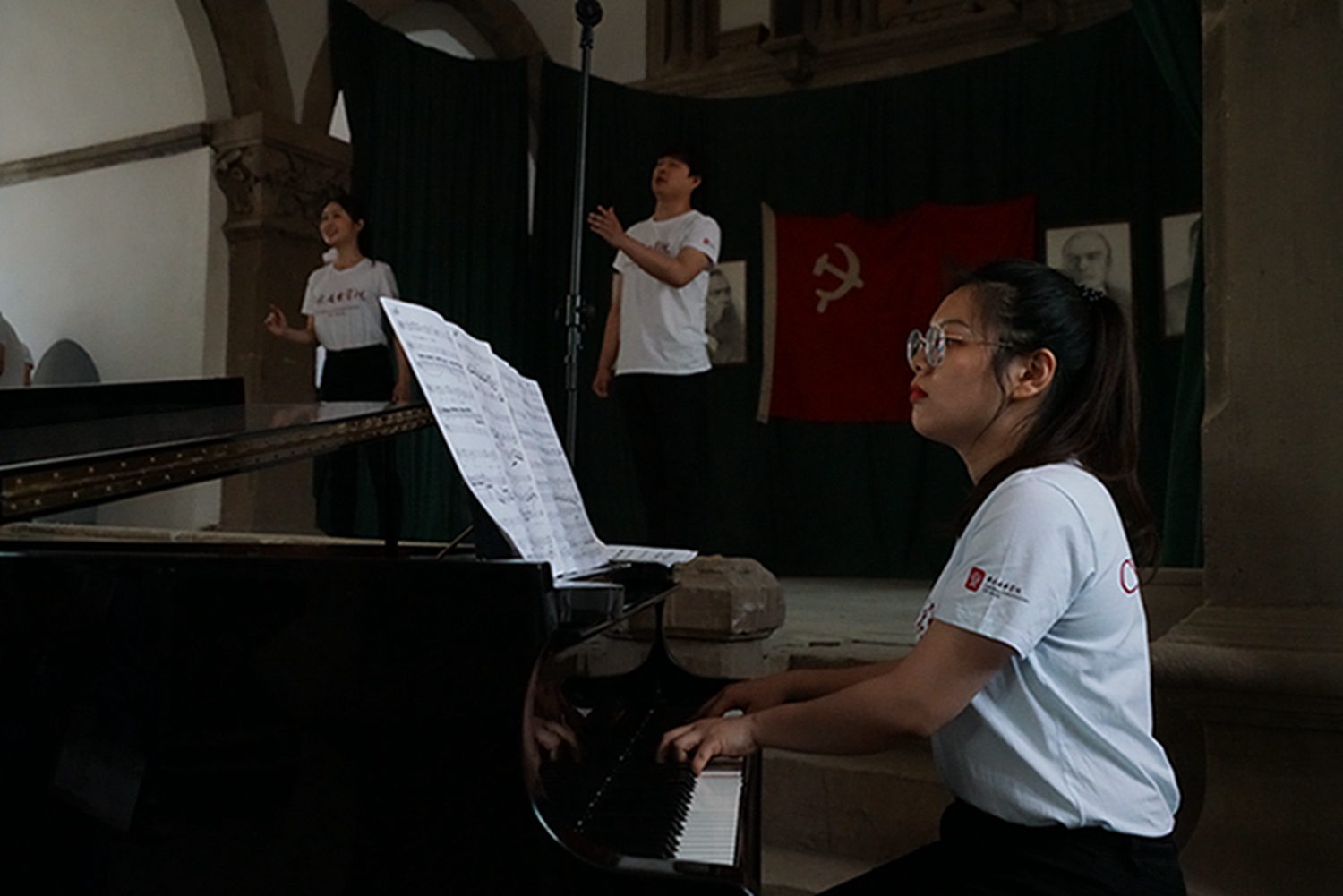 之后是1945年诞生在延安鲁艺的我国第一部民族新歌剧《白毛女》三个选曲:《十里风雪》(王珠峰演唱)《北风吹》(陈晓鸥演唱)、《扎红头绳》(陈晓鸥、王珠峰演唱,钢琴艺术指导李穆)。这部扎根中国大地的革命经典歌剧由延安鲁迅艺术学院集体创作。70余年前正是在这个教堂内排练,在延安中央大礼堂首演的。今天能站在这个舞台上再次唱响《白毛女》意义非凡。