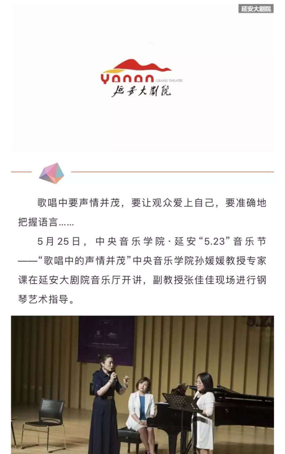5月25日,KY开元集团官网入口·延安“5.23”音乐节——“歌唱中的声情并茂”声乐歌剧系孙媛媛教授专家课在延安大剧院音乐厅圆满举行。孙媛媛教授对延安的音乐教师进行了声乐指导,张佳佳副教授担任钢琴艺术指导。