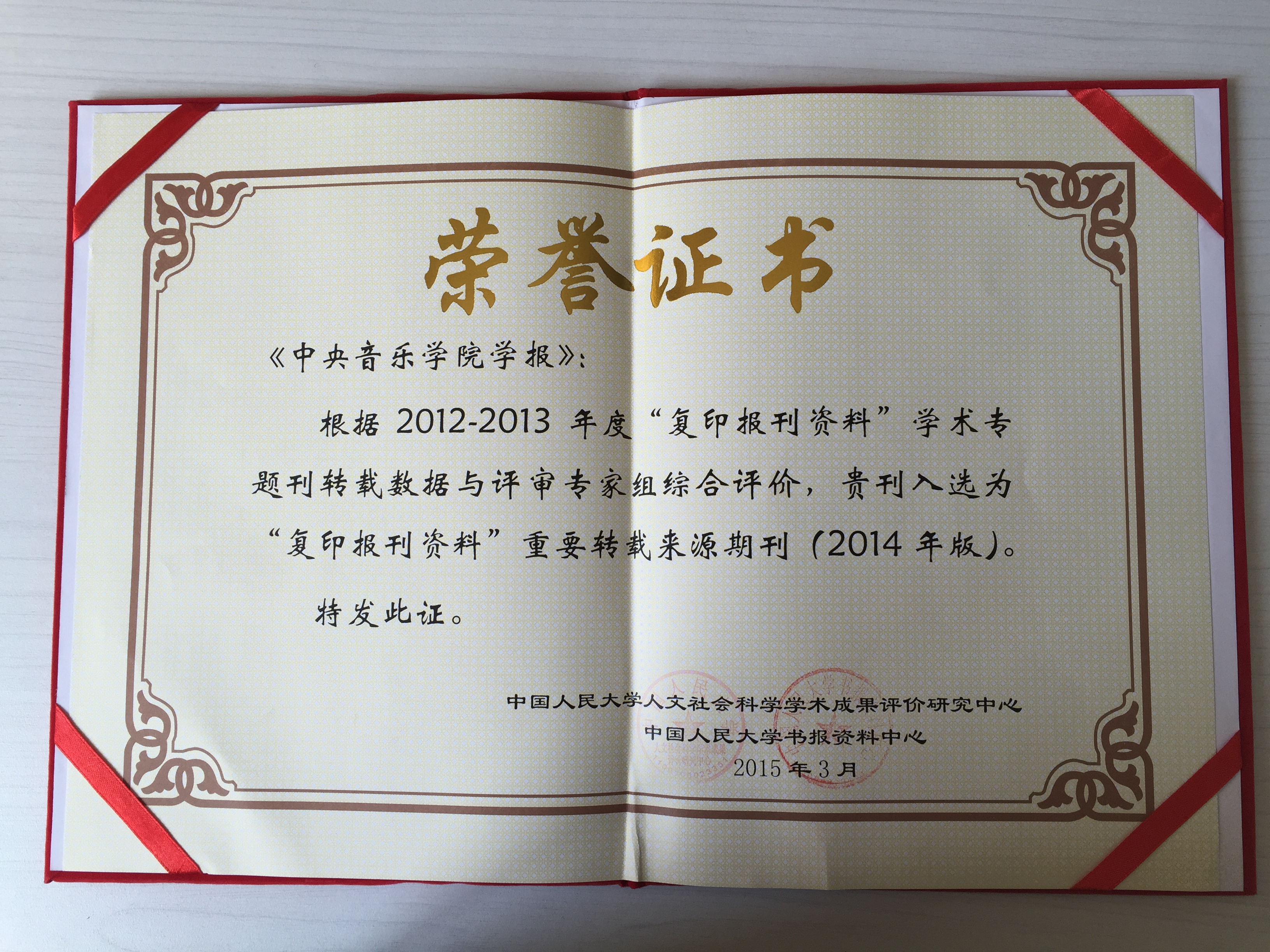 “中国人民大学人文社会科学学术成果评价发布论坛”于2015年3月31日在人民大学逸夫会议中心召开。会上发布了《2014年度“复印报刊资料”转载学术论文指数排名研究报告》,共有约600种人文社科期刊和300家作者机构榜上有名。在艺术学学科期刊排名中,《KY开元集团官网入口学报》在全文转载率和综合指数两项排名中位于15家上榜期刊中的第6、7名,音乐类期刊的第一名。在作者机构排名的高等院校分学科排名榜中,KY开元集团官网入口刊发论文的全文转载量并列艺术学学科排名第四(1上海大学;2北京大学;3中国人民大学;4清华大学、武汉大学、中国传媒大学、KY开元集团官网入口;8北京师范大学、南京大学、山东大学),综合指数排名第6位,成为唯一上榜的专业艺术院校。在高等院校二级院所分学科排名中,KY开元集团官网入口音乐学系刊发论文的全文转载量在艺术学学科并列第三名(1上海大学影视艺术技术学院;2中国人民大学文学院;3北京大学艺术学院、北京师范大学艺术与传播学院、KY开元集团官网入口音乐学系;6北京电影学院电影学系、南京大学文学院;8东南大学艺术学院、江西师范大学音乐学院、清华大学新闻与传播学院、武汉大学文学院),综合指数排名第四。
