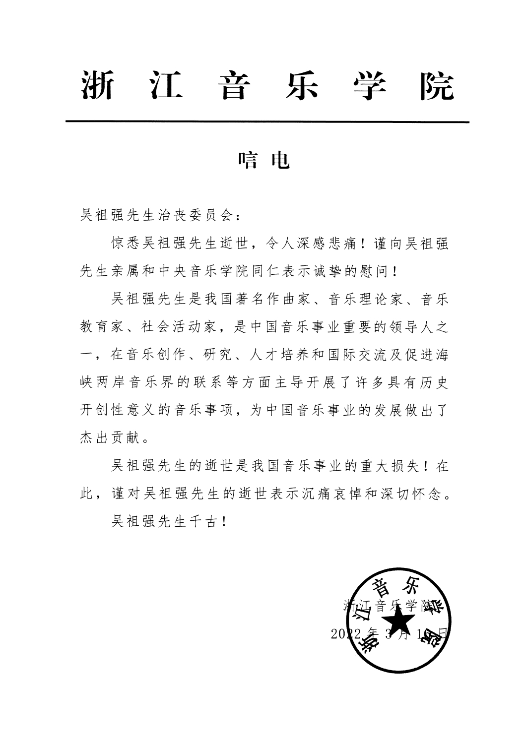 浙江音乐学院致唁电 悼念吴祖强教授