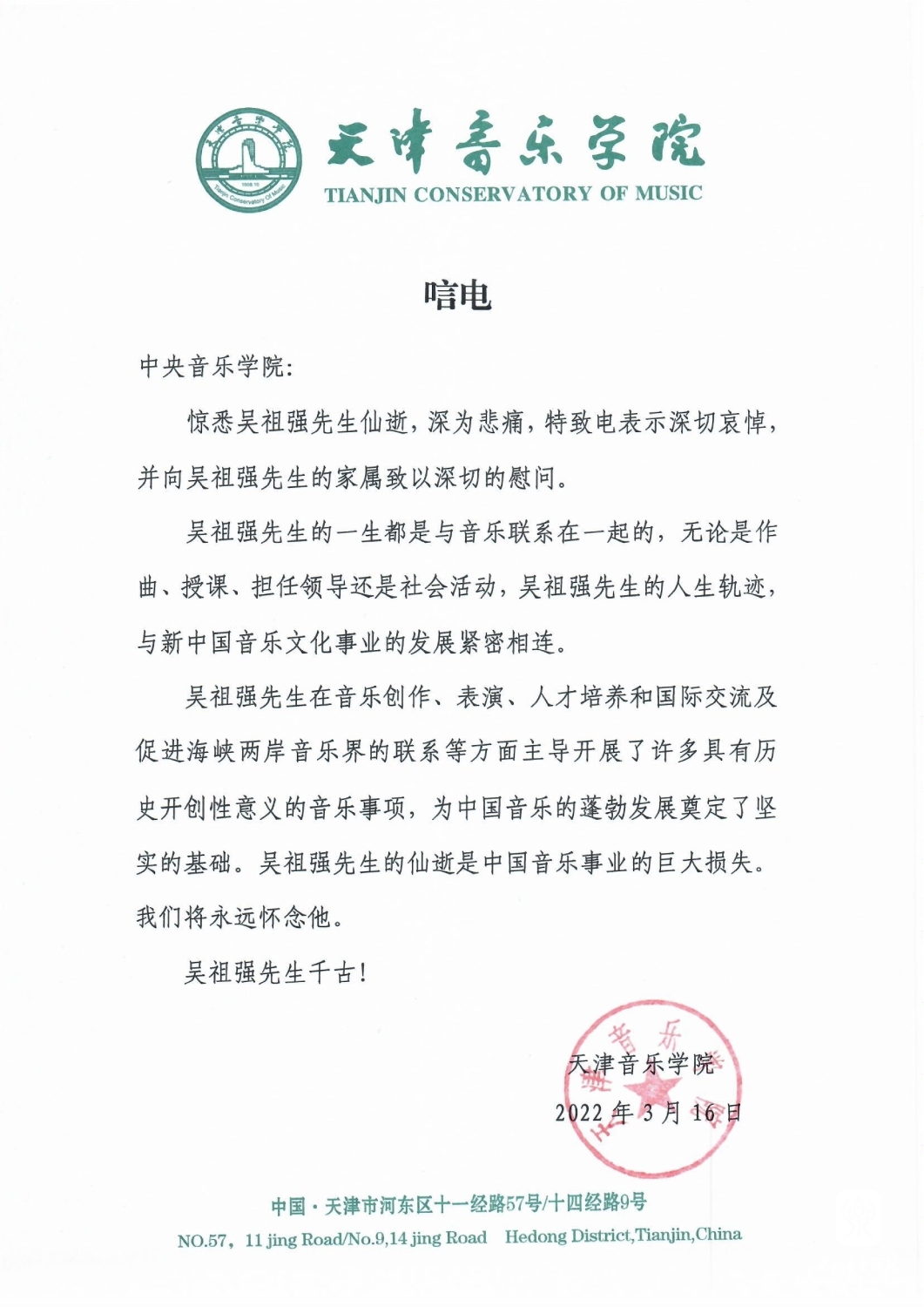 上一条:人民音乐出版社致唁电 悼念吴祖强教授