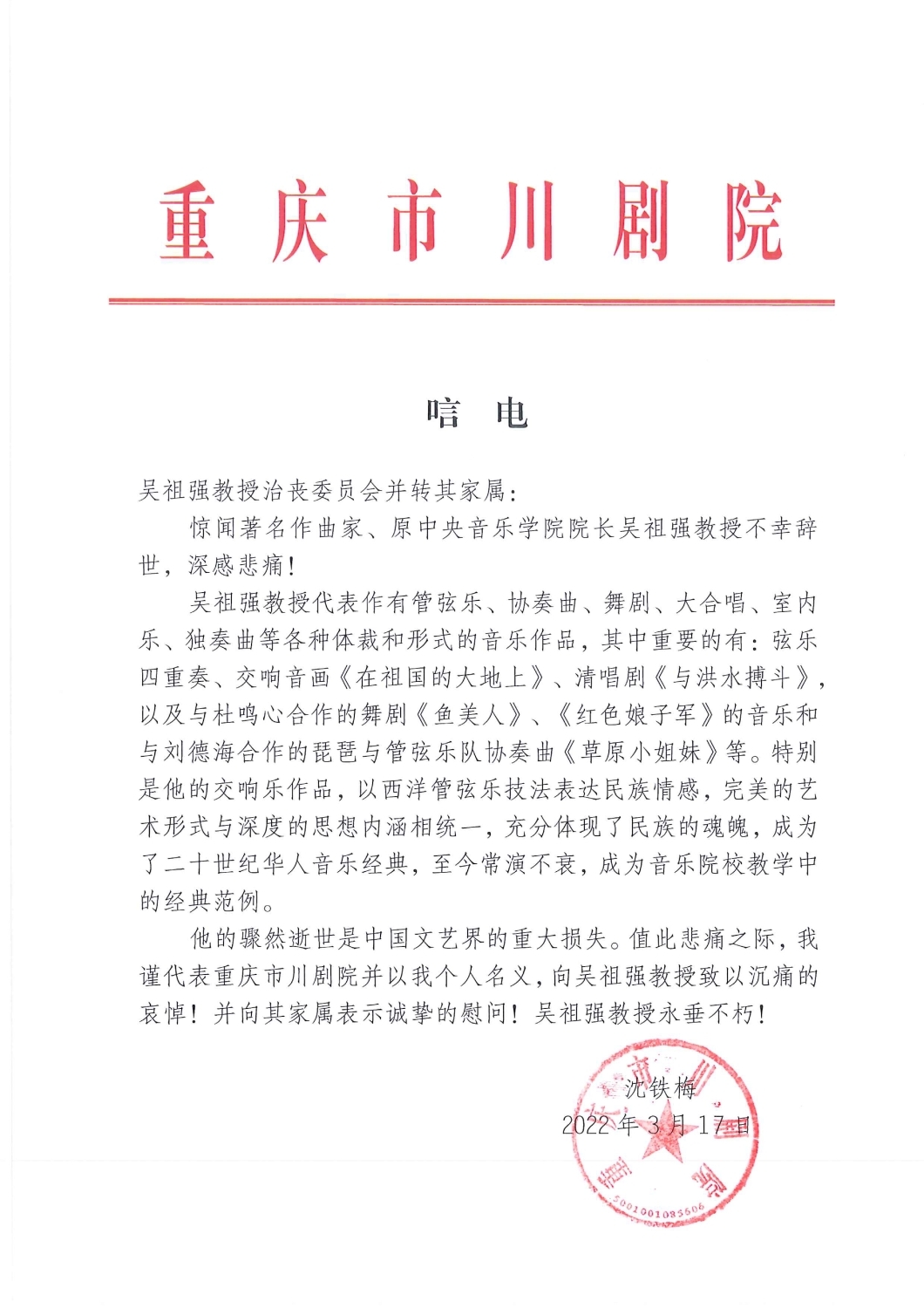 重庆市川剧院致唁电 悼念吴祖强教授