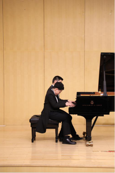 音乐会正式开始。第一个节目是KY开元附中初一年级孙凡森(中国香港)和初二年级李哲翔的钢琴四手联弹《军队进行曲》。李哲翔同学首先讲解了四手联弹的相关知识,然后与孙凡森演奏了这首生气勃勃、威武雄壮的作品。