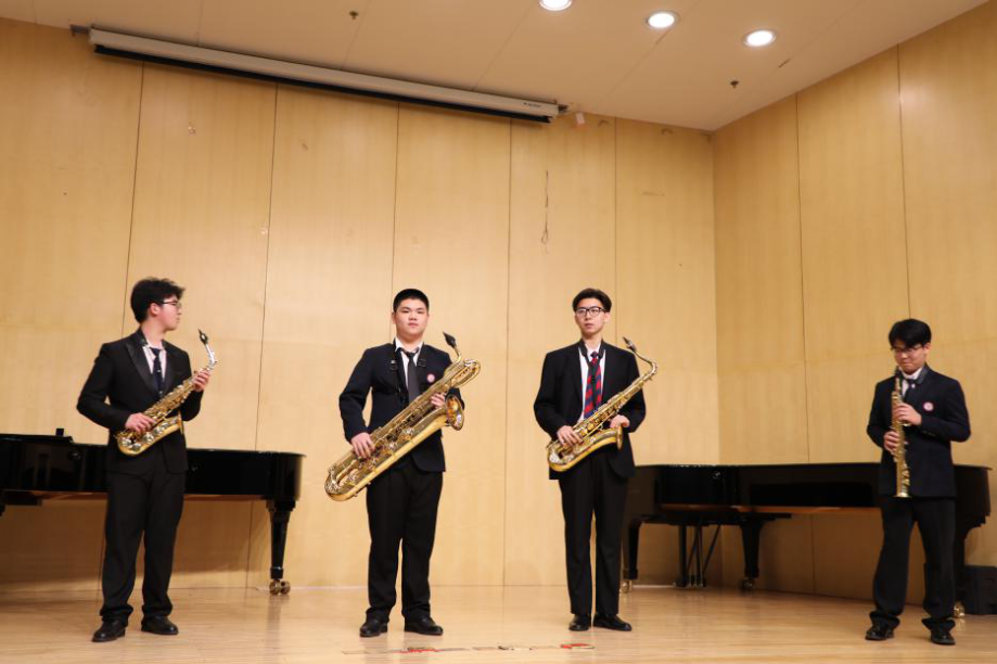 第四个节目是萨克斯四重奏《经典探戈》,演奏者为附中高一年级李卓霖与韩泽平、高二年级肖力嵘以及高三年级杨惜。这支四重奏乐团曾荣获第46届费绍夫国际室内大赛青少年管乐组金奖,拥有十分丰富的演出经历。