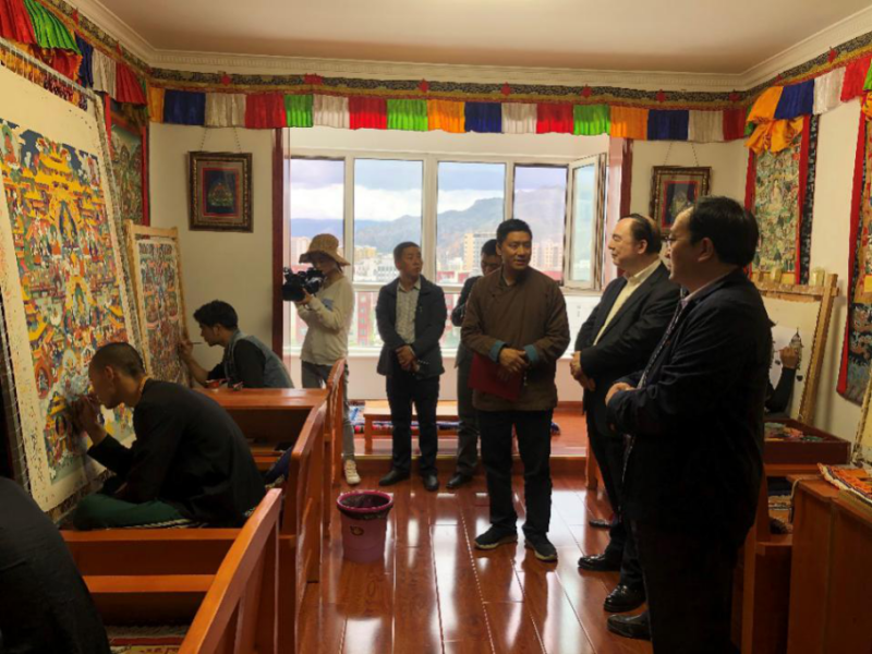 随后,在县委领导的陪同下,俞峰院长一行又来到化隆宗喀噶哇仓非遗文化开发有限公司,参观了藏式传统工艺品-唐卡的制作过程。