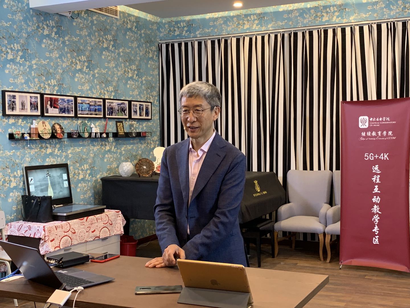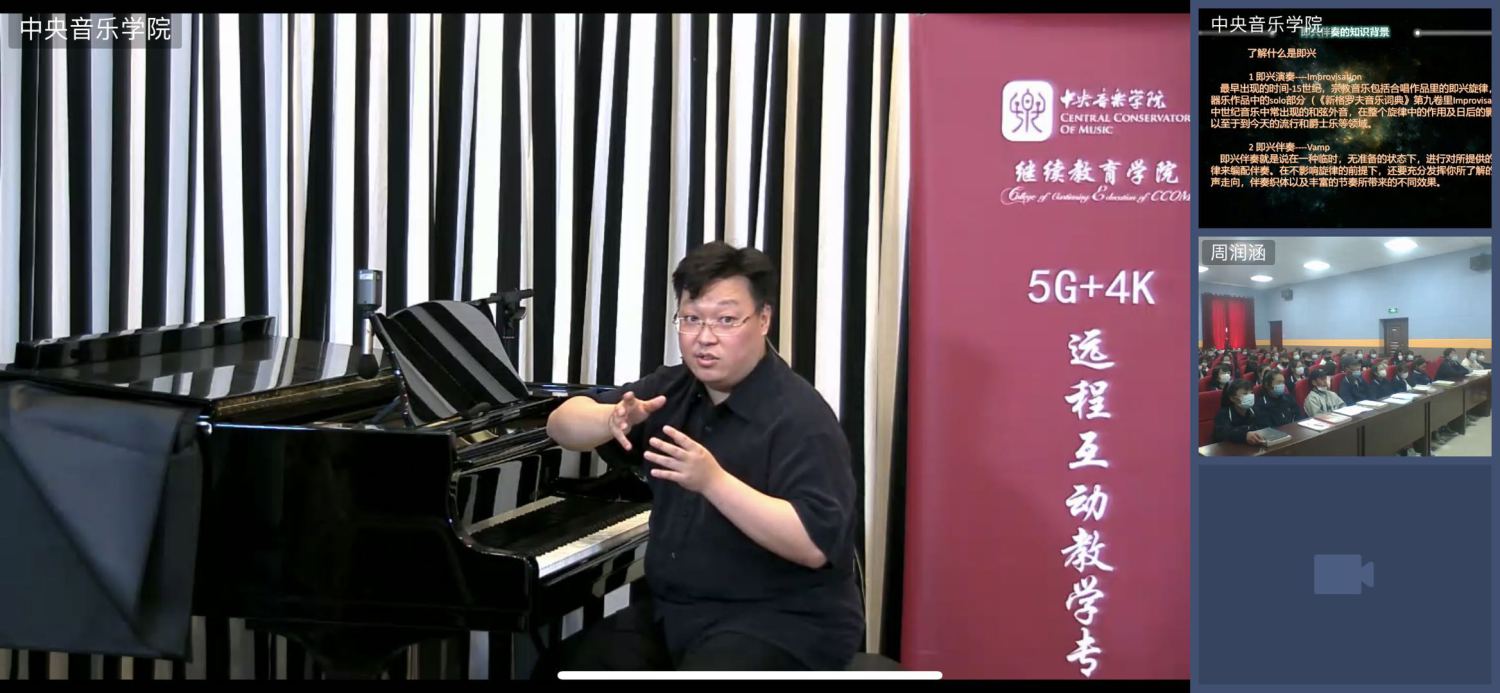 5月12日,作曲系教师姜蓓雅运用继续教育学院自主研发微课动画课件,形象、直观地讲解趣味乐理知识学习与应用。中国东方演艺集团即兴钢琴演奏家曲大卫详解钢琴即兴伴奏教学法与演奏技巧训练。